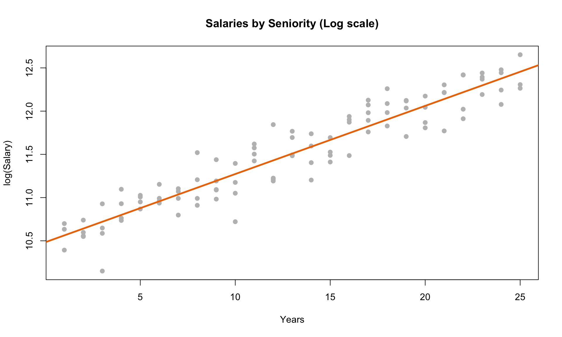 main = "Salaries by Seniority (Log scale)", xlab = "Years", ylab = "log(Salary)")