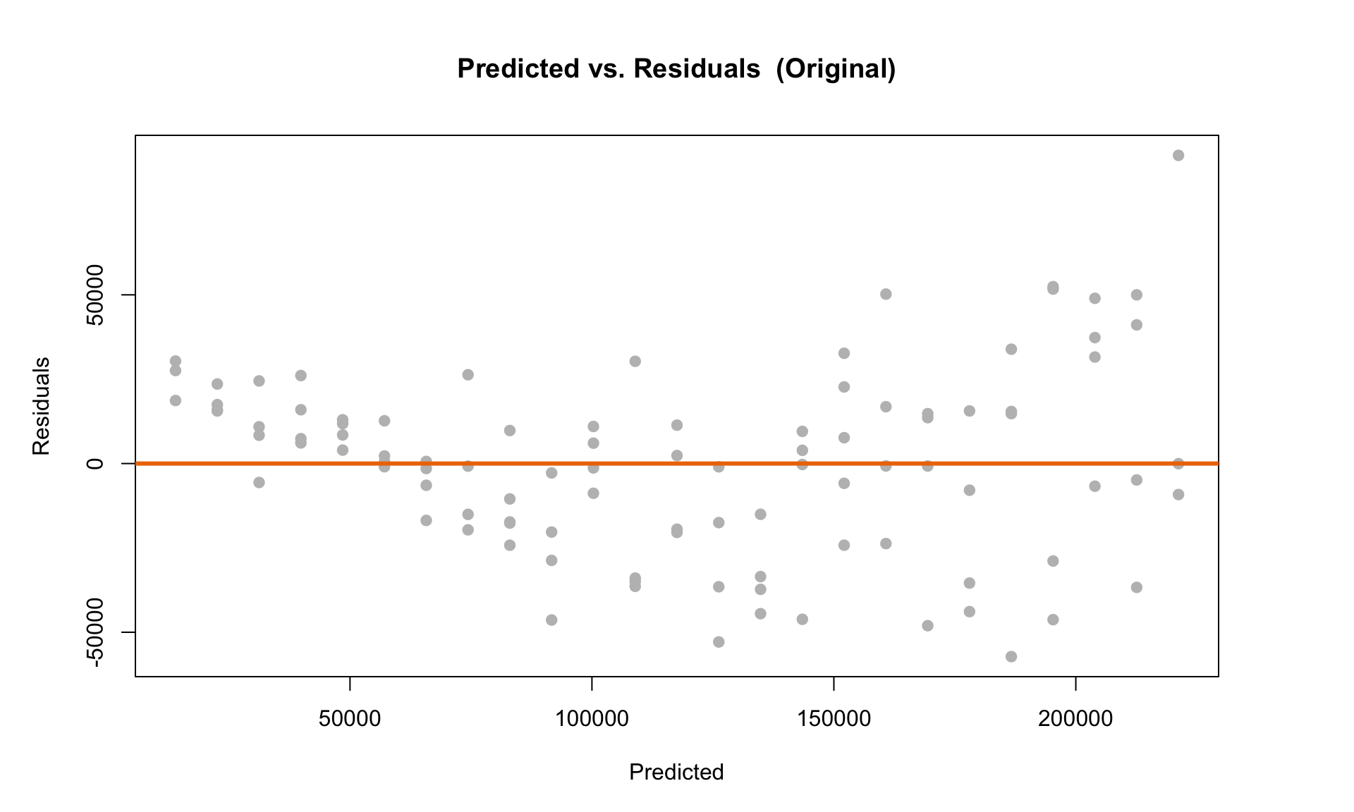 The line seems to fit the data reasonably well. Let’s now consider a plot of the residuals against the predicted values from the model:
