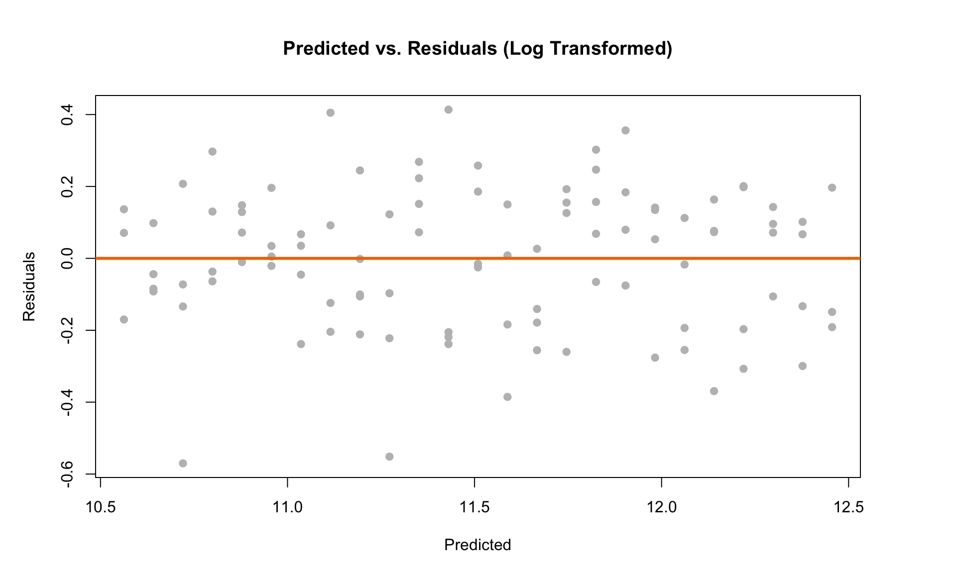 The plot on the left clearly violates LINE. But we can see that after doing the log transformation, the residual scatterplot looks like it satisfies the diagnostic plot criteria outlined above.