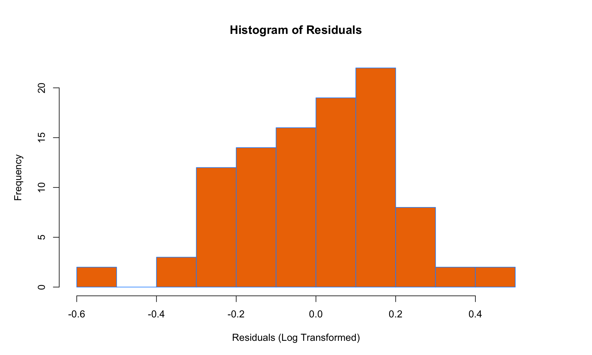 The histogram of residuals of the log-transformed model doesn’t appear to deviate too much from the Normal distribution, so all four LINE conditions seem to be satisfied after the transformation. (Note: There is obviously some subjectivity here – what we are most interested in are dramatic and obvious violations of LINE). This suggests that applying a log transformation to the salary data was a good idea!