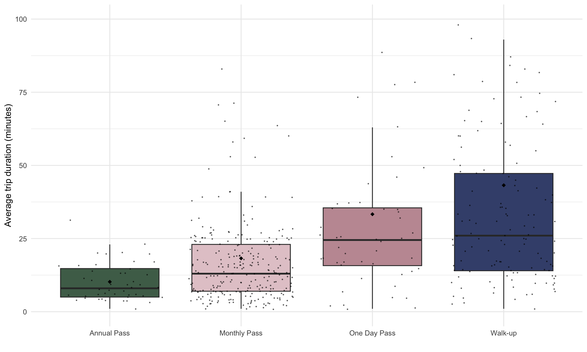The black diamonds in the box plot above shows the mean trip duration, and the horizontal black line shows the median trip duration. Note that the mean trip duration is longer for the one day and walk-ups than annual and monthly pass. Is this different indicative of a true difference between passholders, or is it specific to our random sample of trip data? We can determine which explanation is more plausible using a hypothesis test for means.