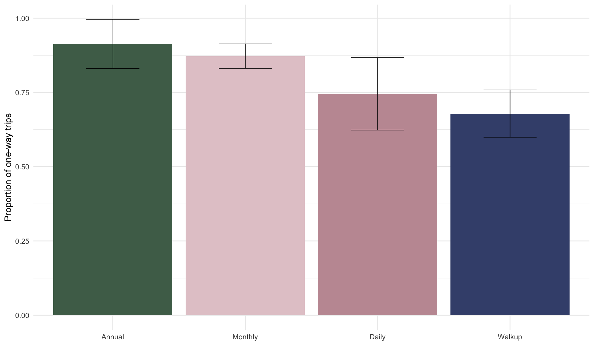 Suppose we now want to compare annual passholders to monthly passholders. We can see from the bar chart above that annual passholders are slightly more likely to make one-way trips than monthly passholders. Does this hold in general?
