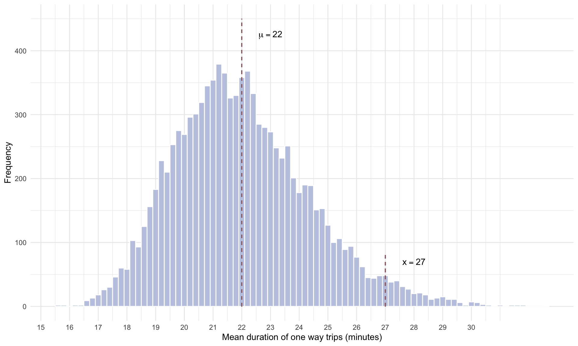 To illustrate, suppose in a random sample of \(n = 100\) trips by monthly passholders, we obtain a sample mean of \(\bar{x} = 27\) minutes. Suppose now we wish to test whether the true mean is \(22\) minutes. In this case, the hypotheses are