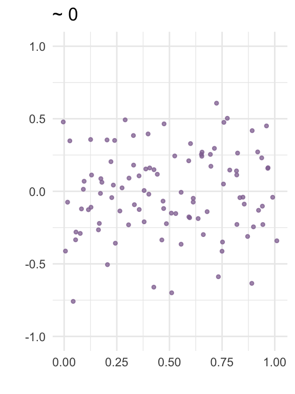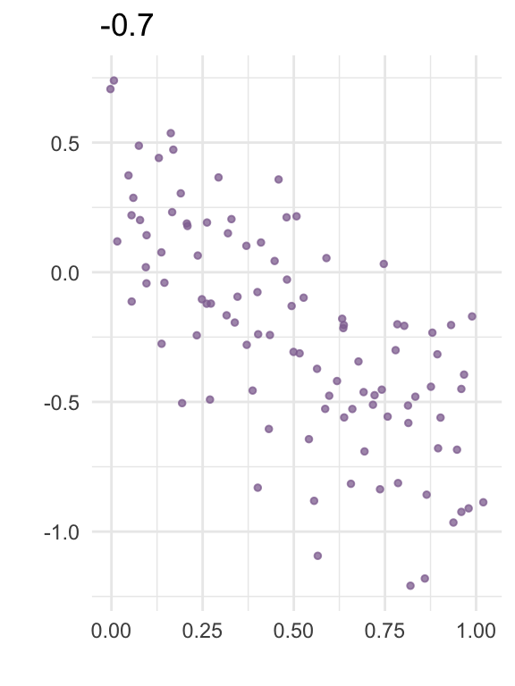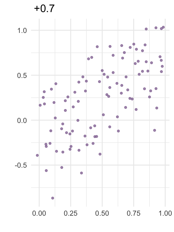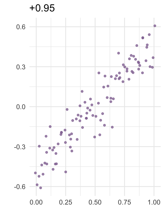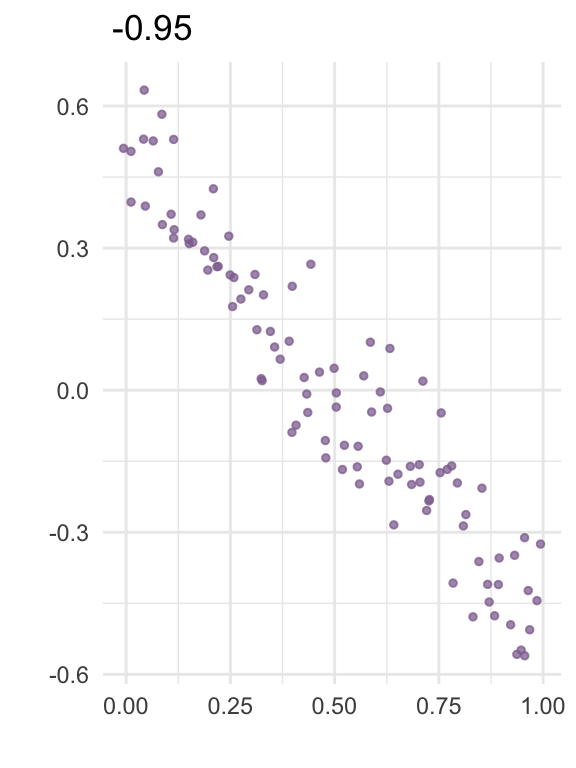 The correlation between two variables is a number between -1 and 1 that expresses how strongly the variables “move together”. The plots below visualize correlation for some random data: