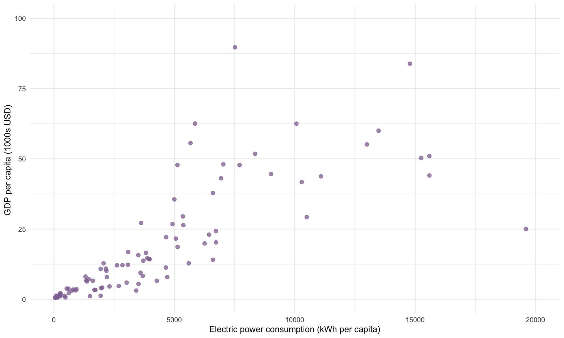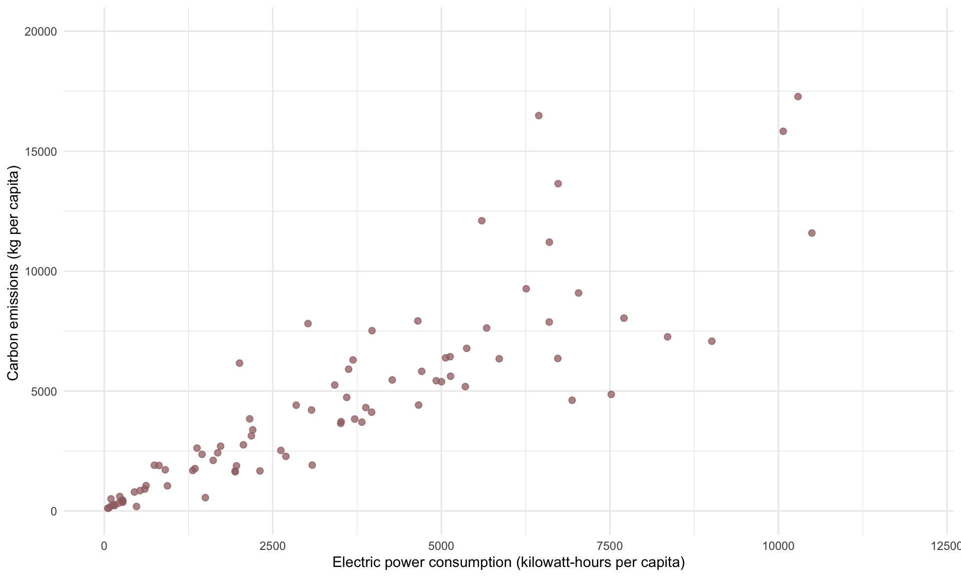 For this example, we will try to predict the CO2 emissions of a country from the remaining variables. Our focus will be on inferring the association between electric power consumption (in kilowatt-hours per capita) and CO2 emissions (in kilograms per capita).