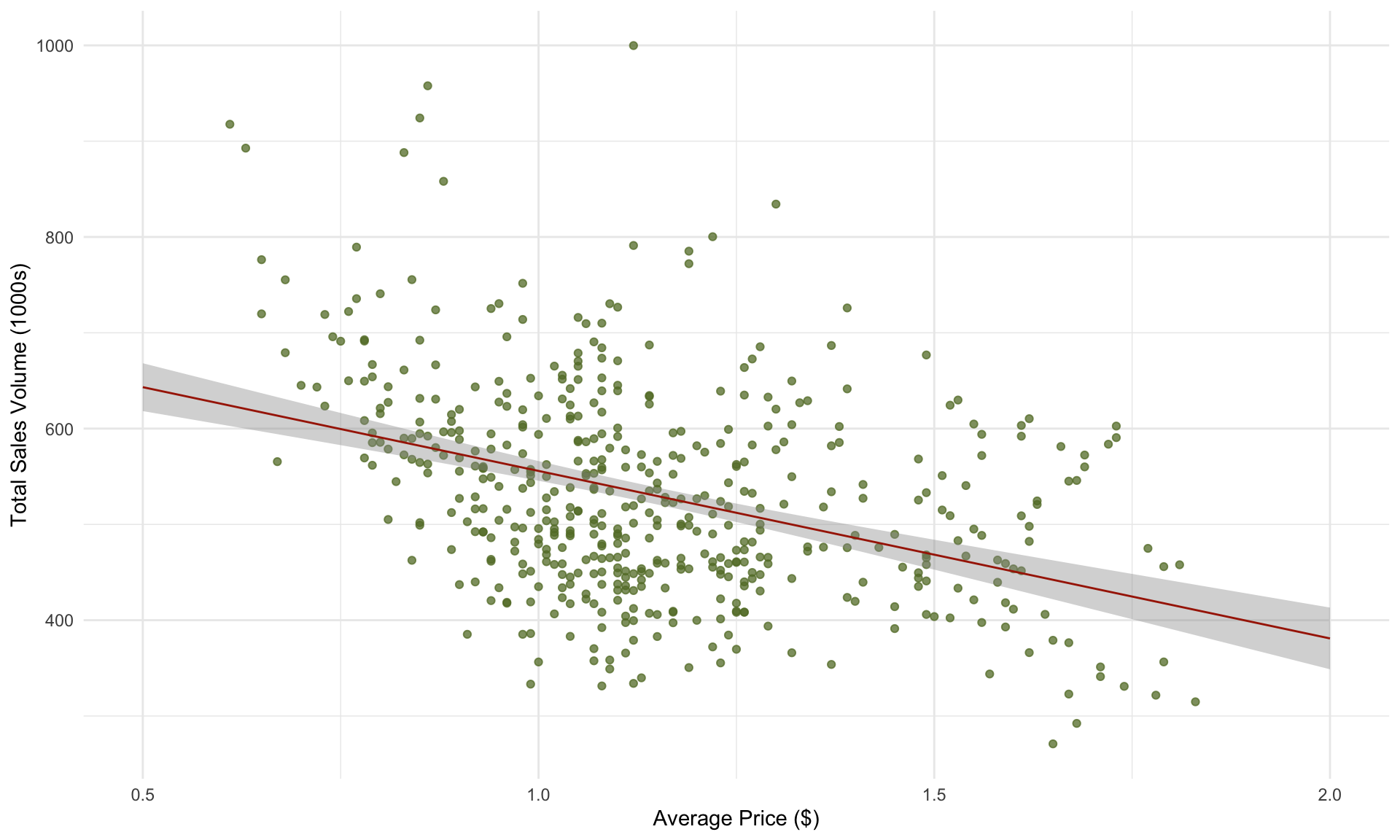 As a benchmark, we consider a simple regression model of volume on price for conventional avocados only. We start by filtering to only pull data for conventional avocados: