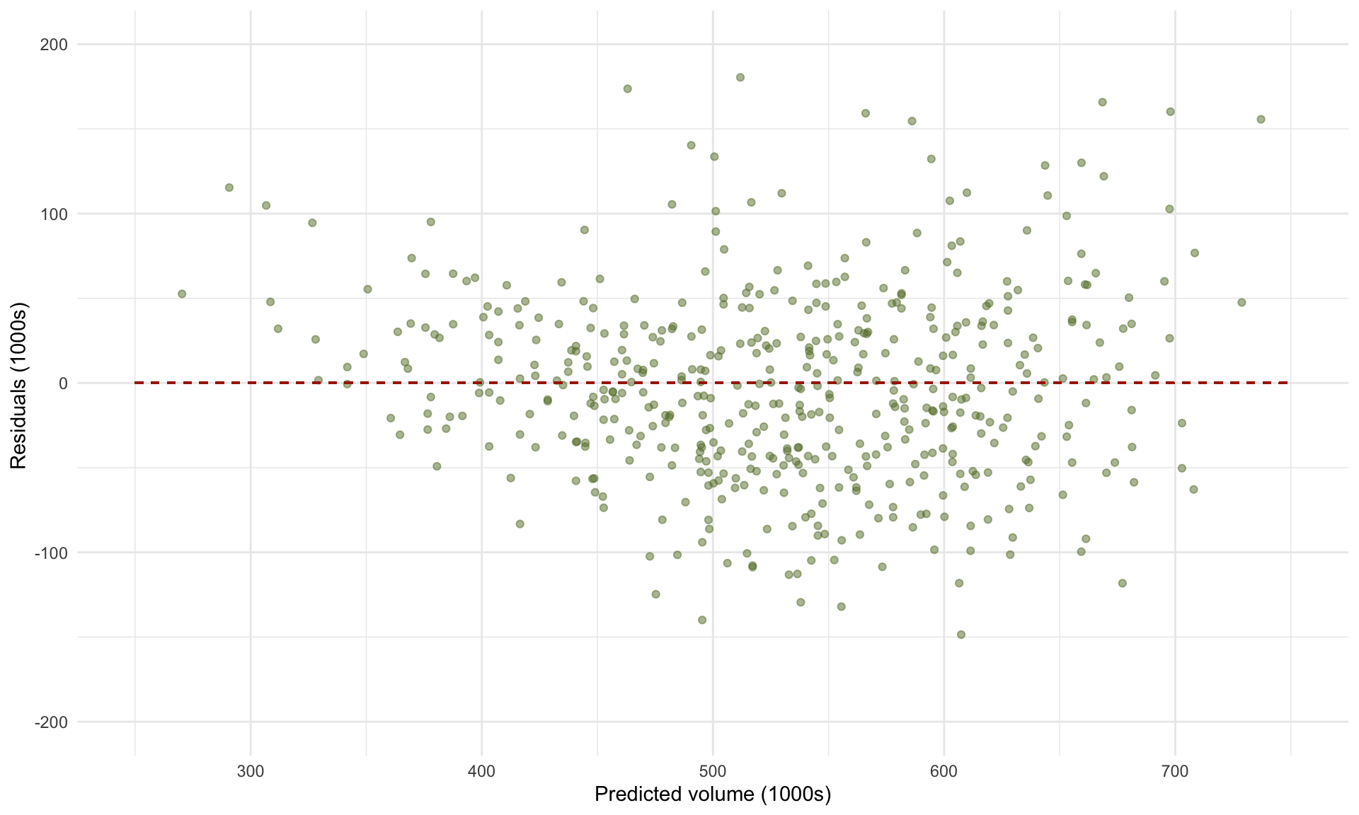From the model above that includes year and season variables, we obtain the following scatterplot of actual vs. predicted volumes:
