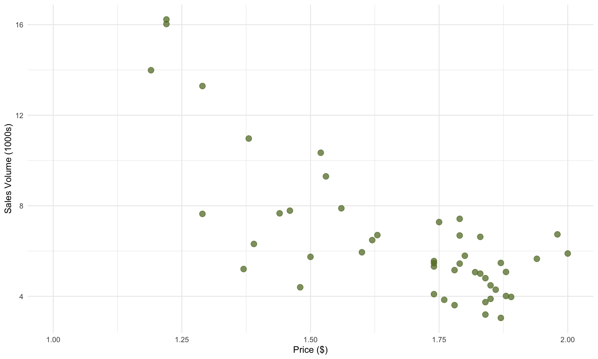 Fortunately for us, not knowing the cause-and-effect between price and sales is not a problem, because our goal is to simply understand the association between price and volume, without drawing conclusions on why.