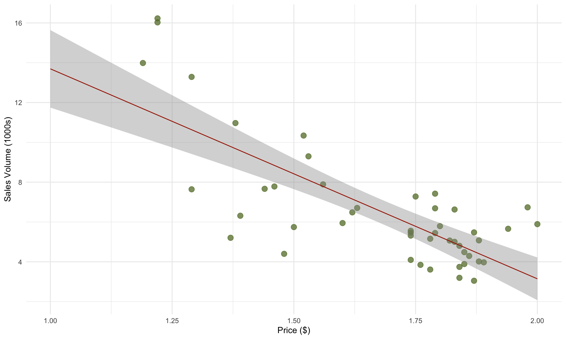 \[ \text{volume} = \beta_0 + \beta_1 \cdot \text{price} + \varepsilon\] where \(\beta_1\) is the slope for the price variable that we want to estimate from the data.