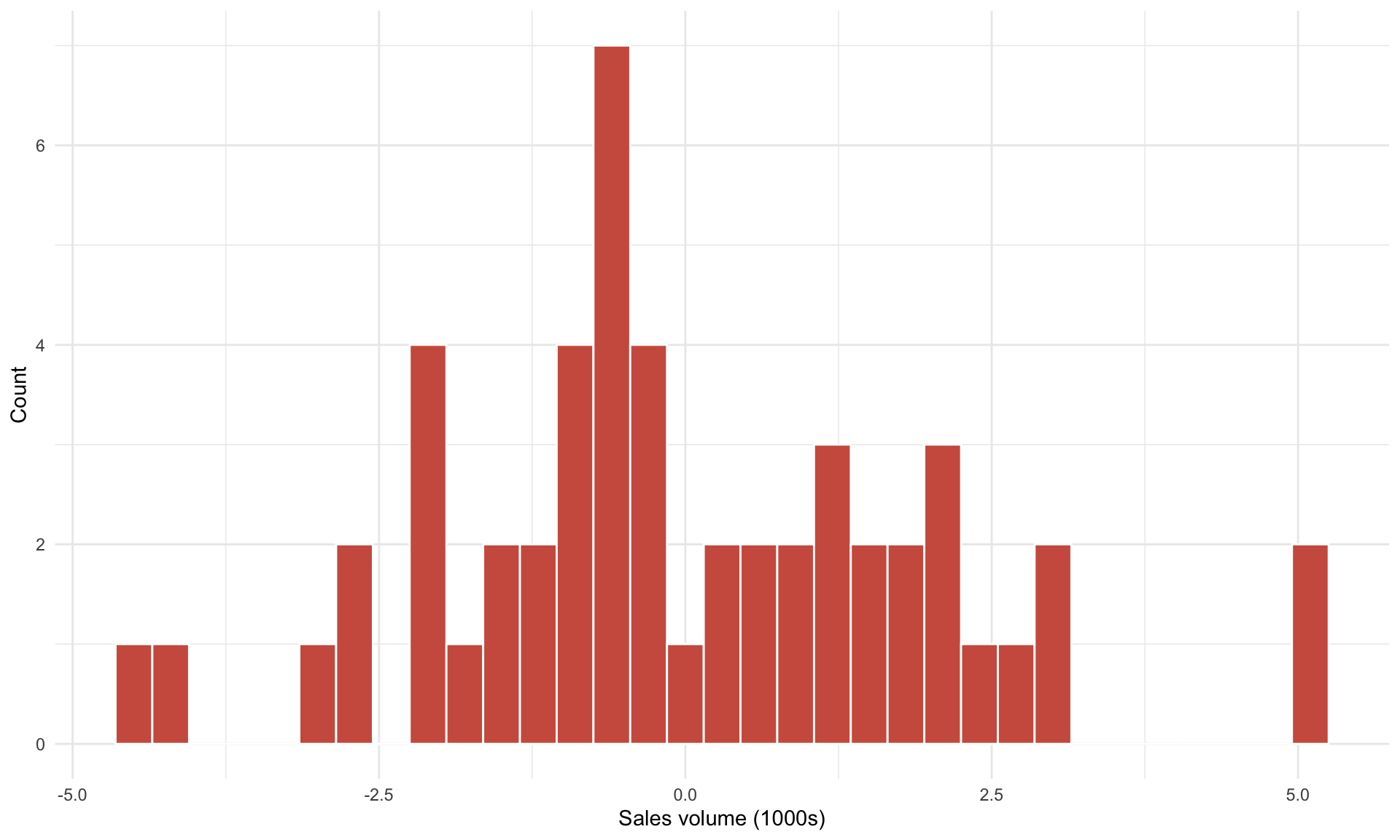 While an \(R^2\) of \(0.54\) may sound low, it is not surprising when we consider that 54% of the sales volume is explained by price alone, and the remaining 46% are all other variables. \(R^2\) values of this magnitude or much lower are quite common in regression models when working with real-world, messy data.↩︎