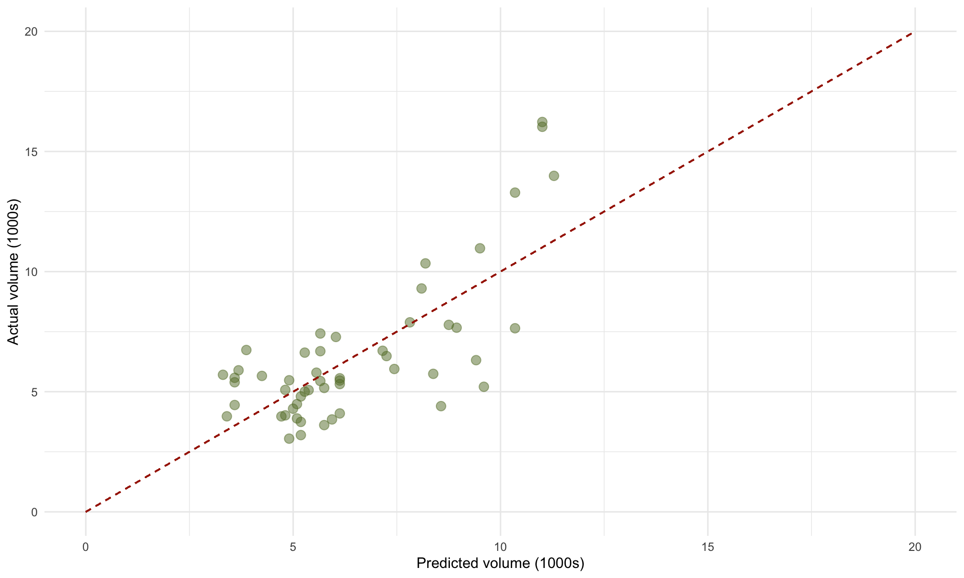 The 45 degree line represents perfect prediction accuracy – deviations from this line correspond to prediction errors (i.e., residuals). The plot of predicted vs. actual volumes can be useful in identifying where the model’s predictions are likely to be less accurate, or based on a small amount of data. In the plot above, we can see that the errors appear larger when the actual volumes are large (around 15 on the vertical axis). This suggests that we may want to be more cautious about our model’s predictions at larger sales quantities.