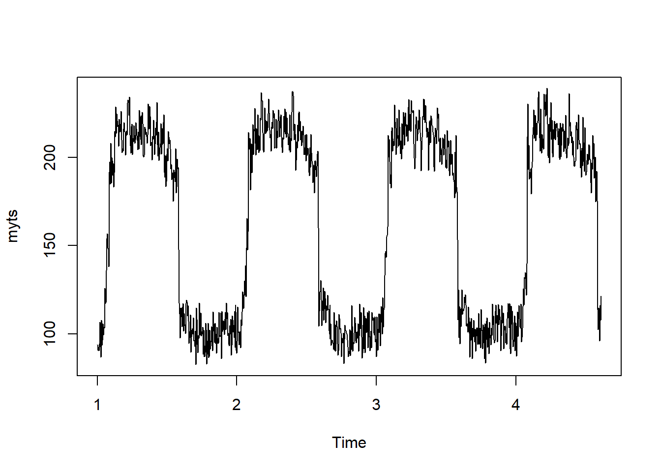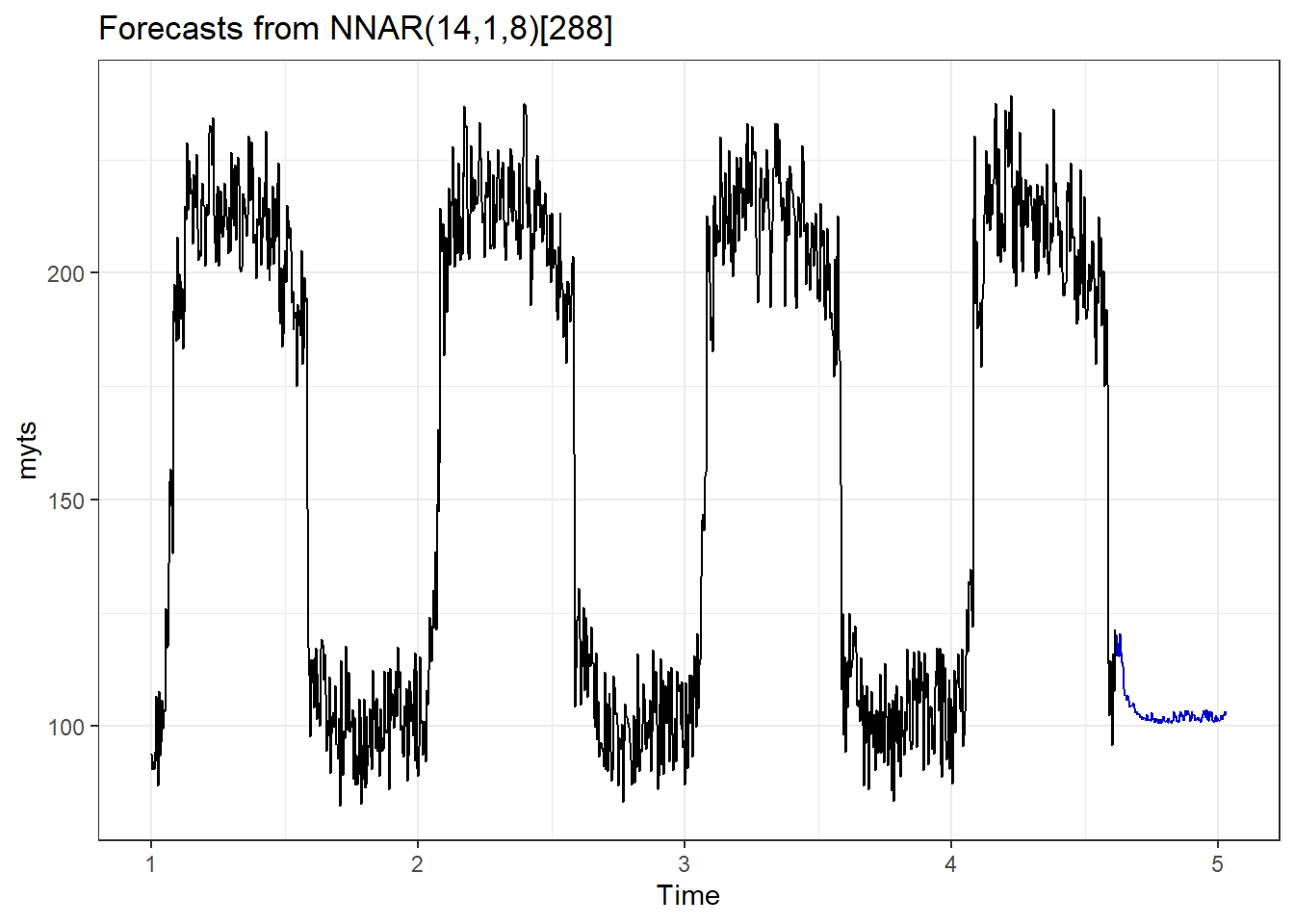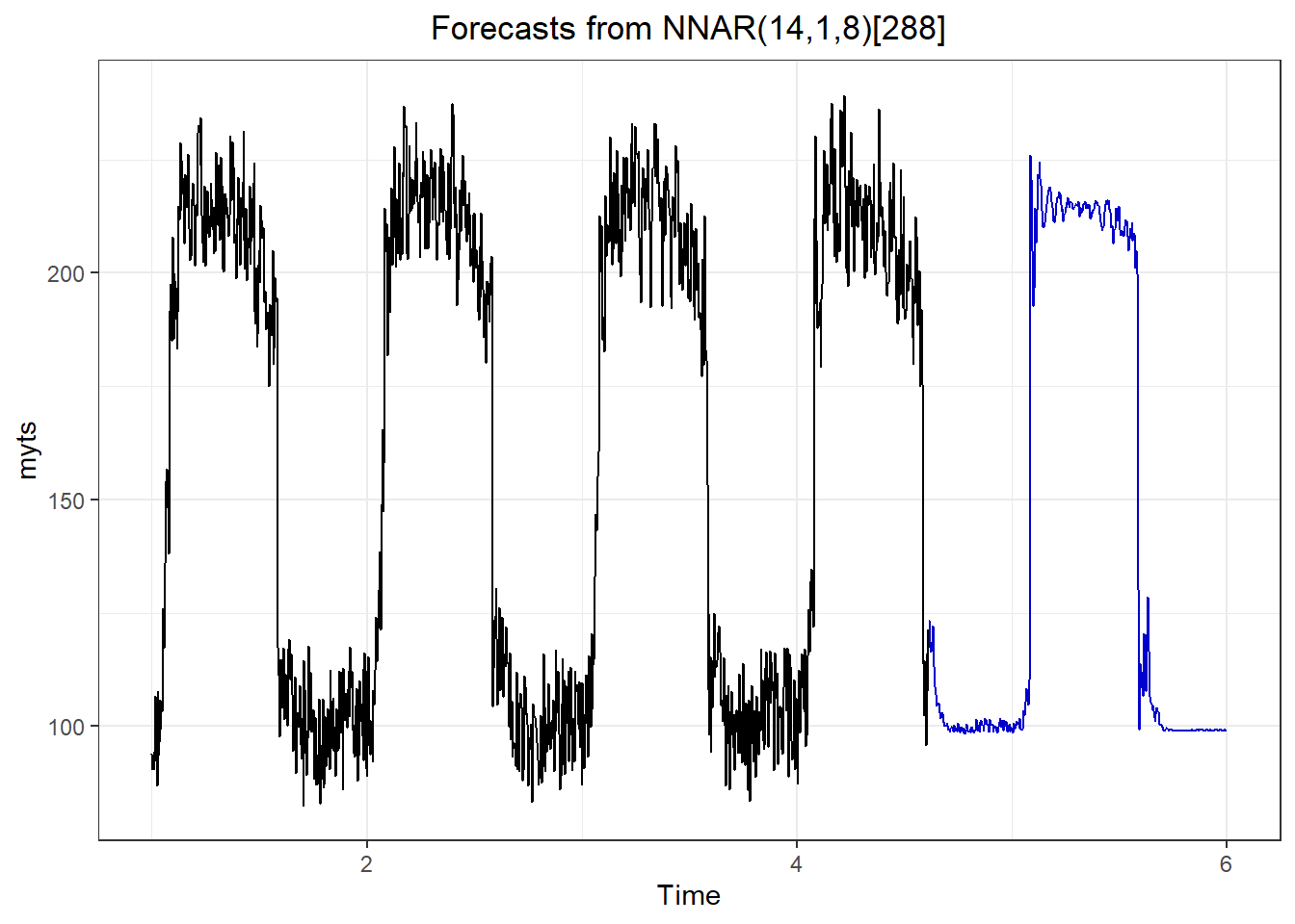 nnetforecast <- forecast(fit, h = 400, PI = F) #Prediction intervals do not come by default in neural net forecasts, in constrast to ARIMA or exponential smoothing model