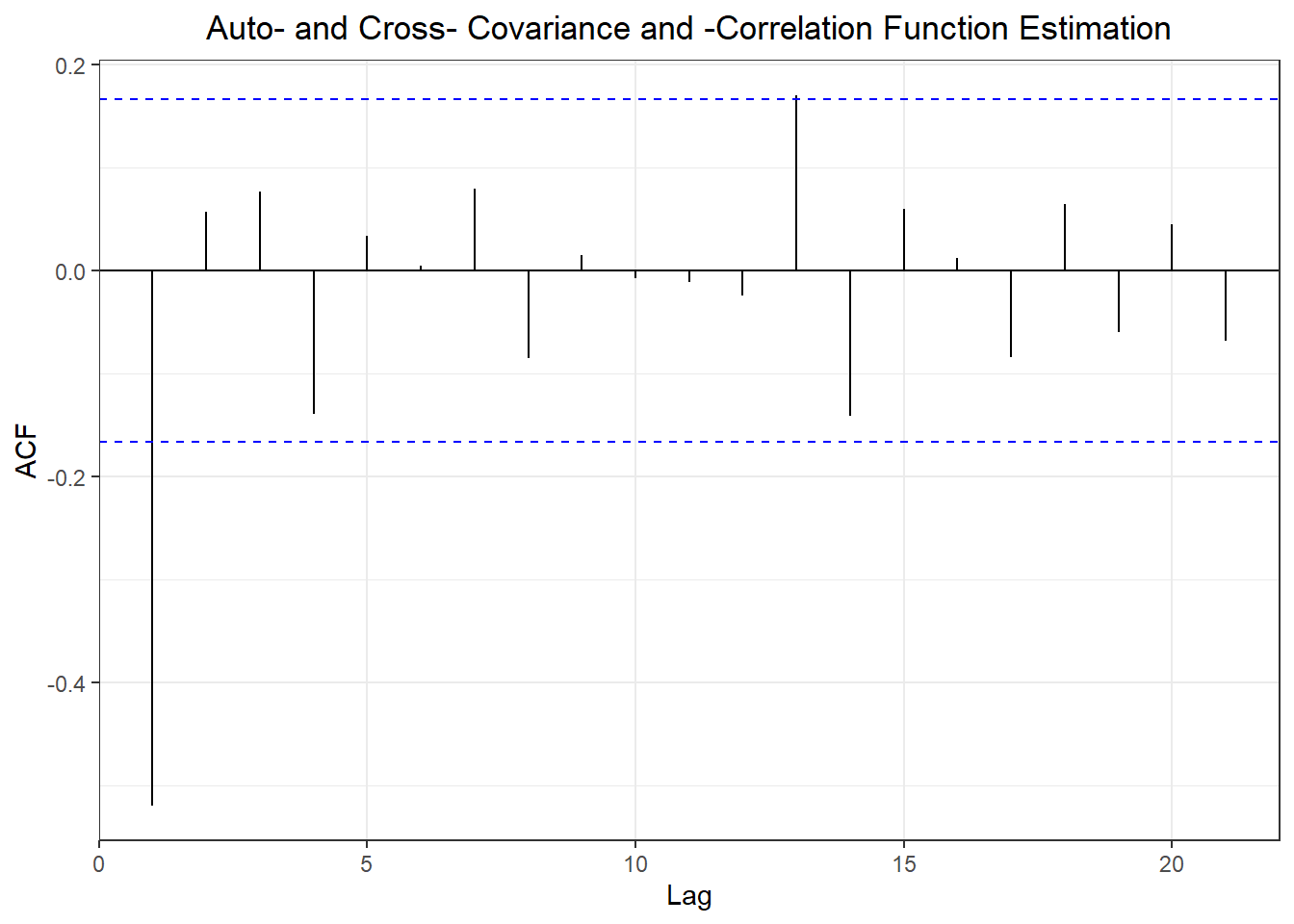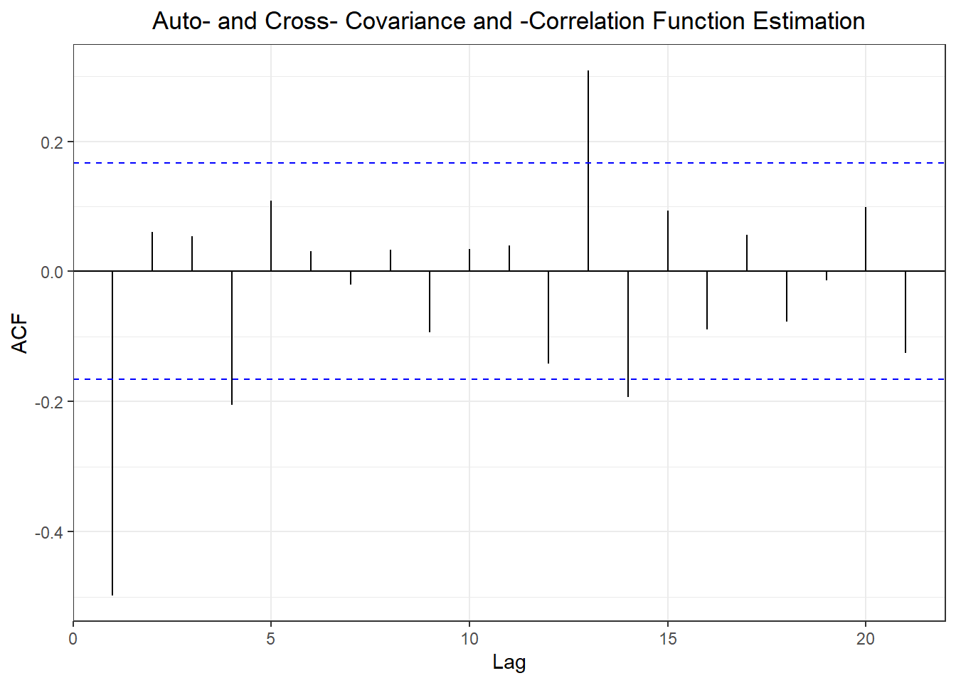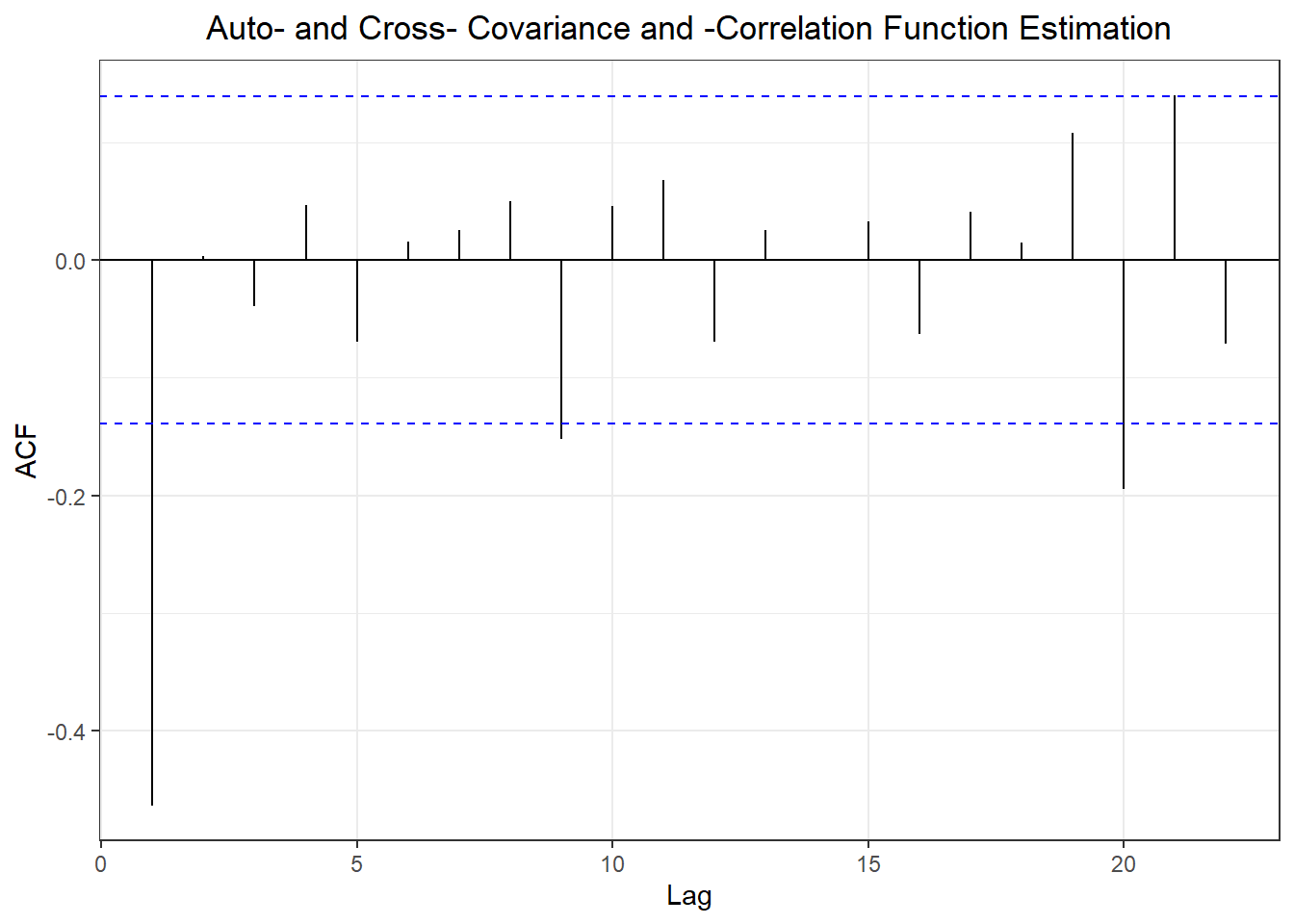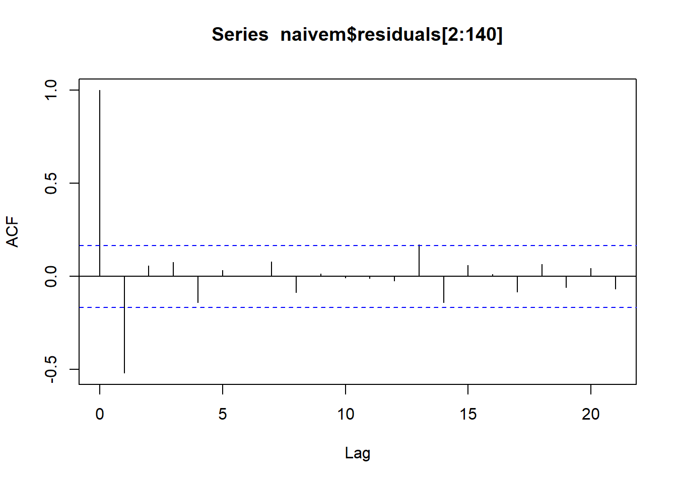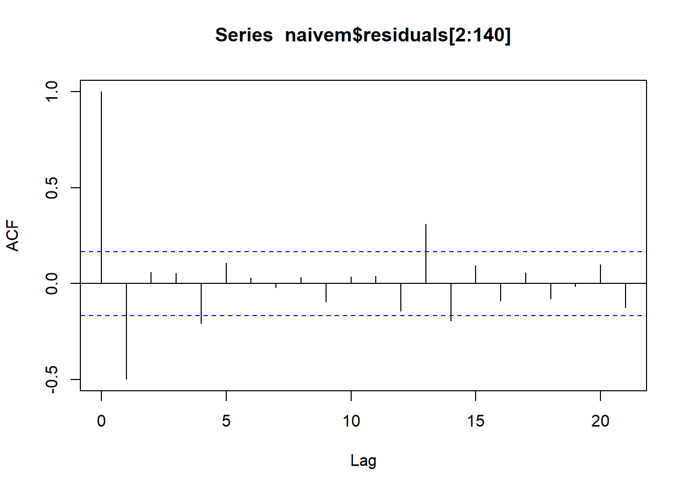 acf(naivem$residuals[2:140]) # autocorrelation test, autocorrelation present