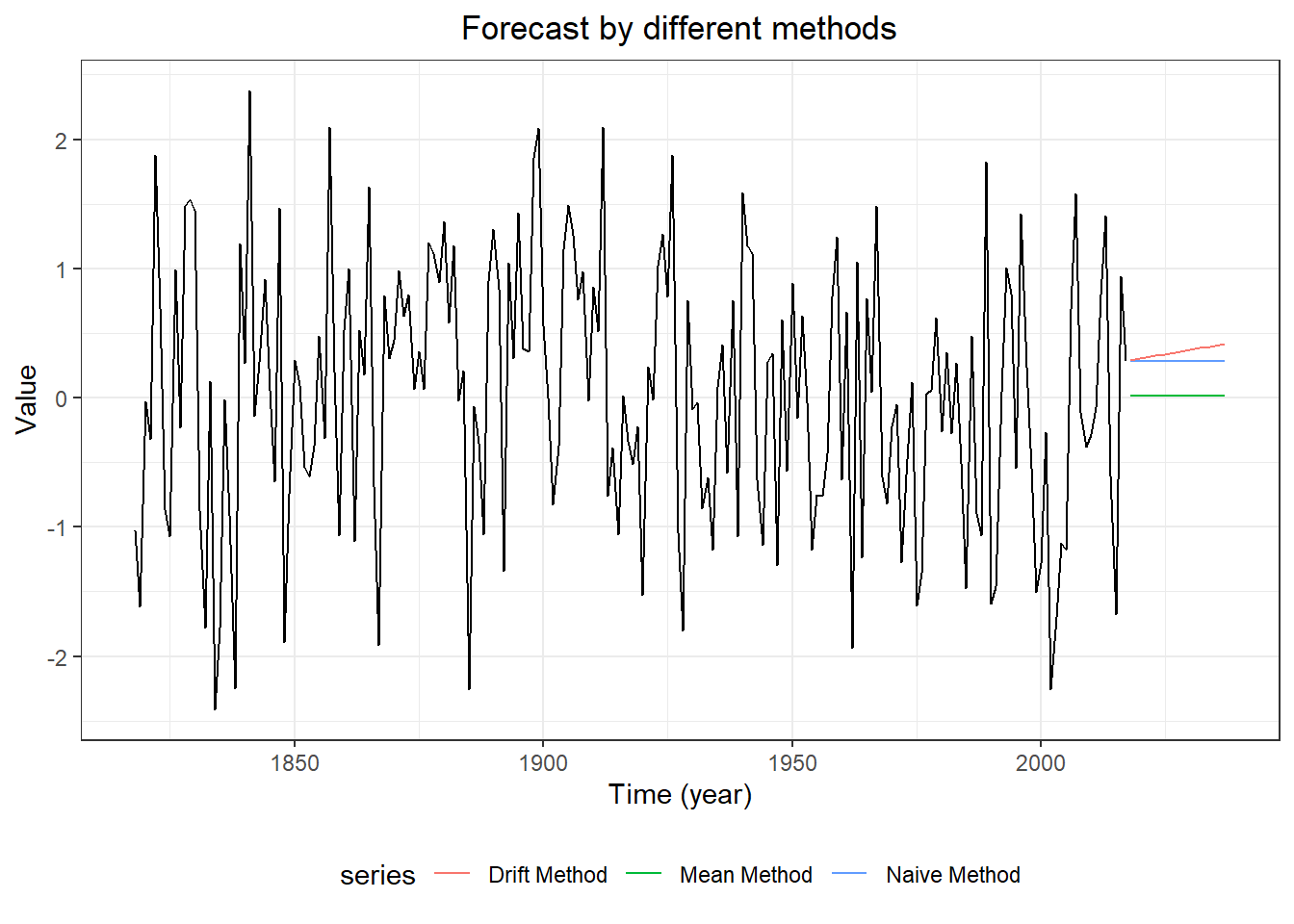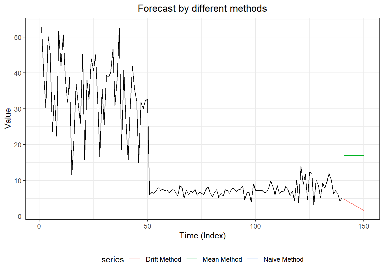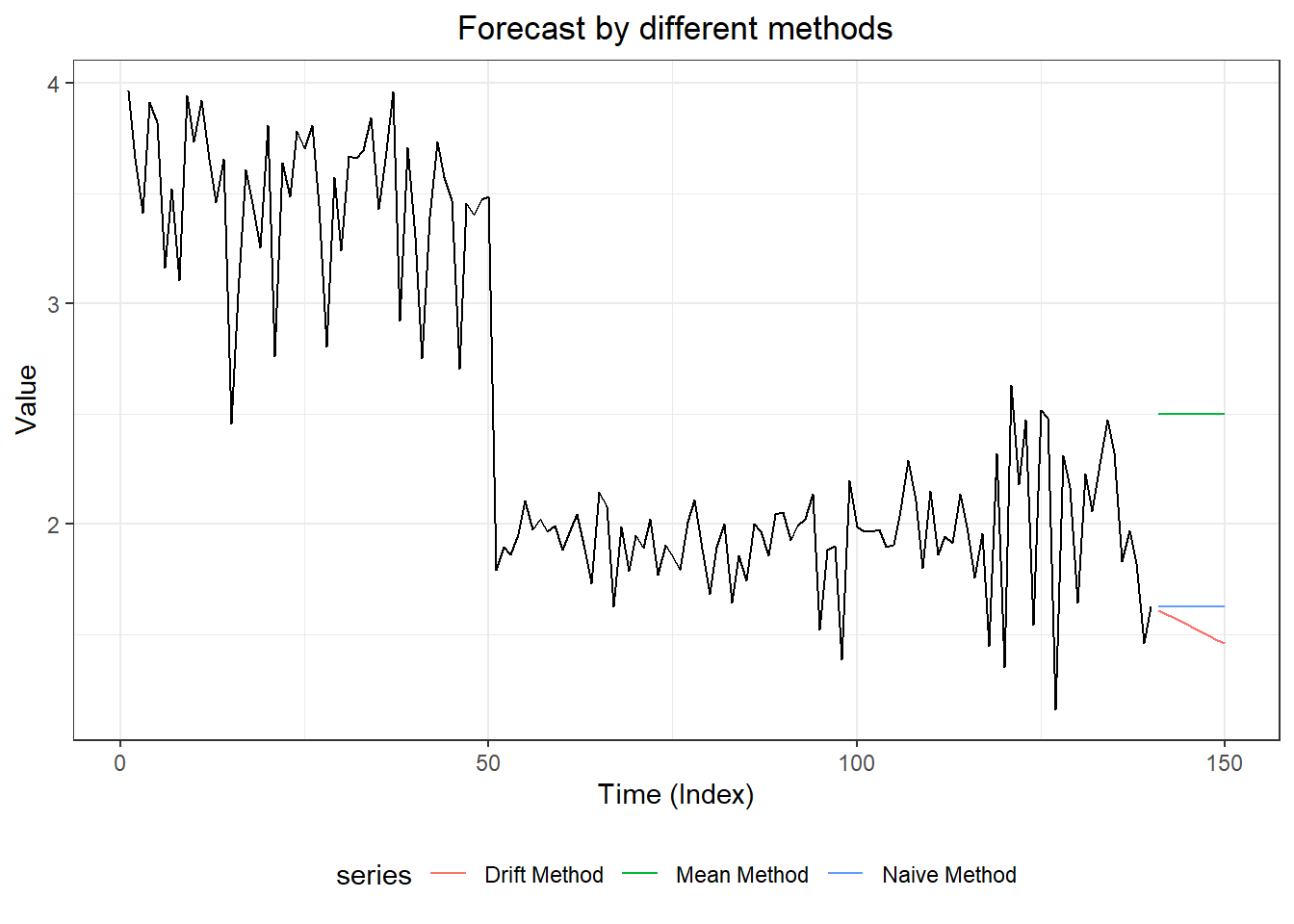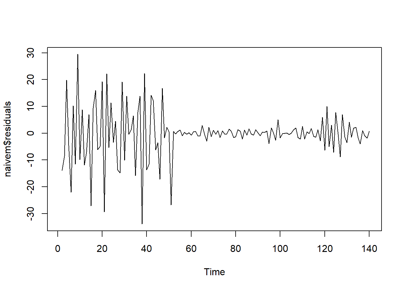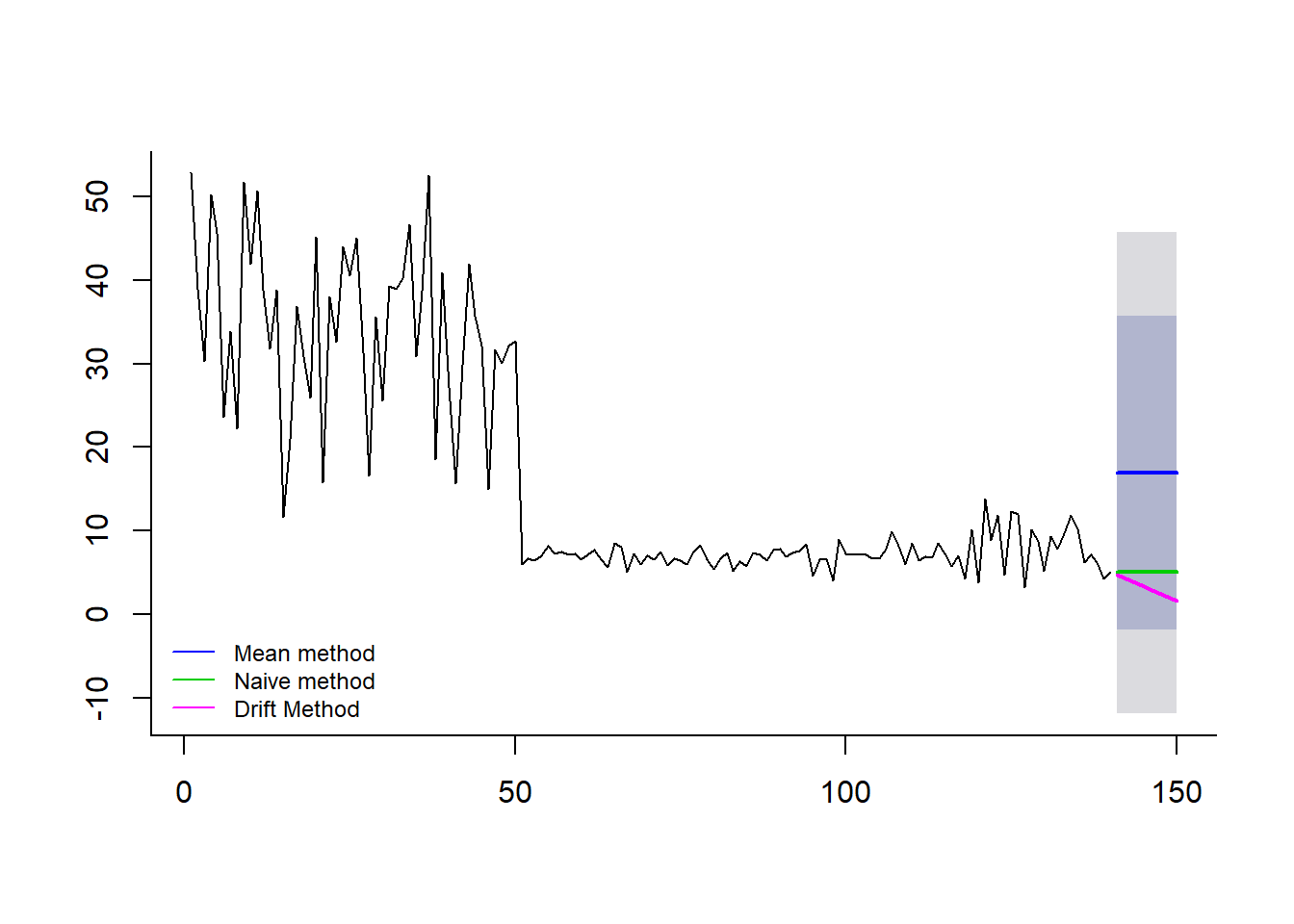 naivwithoutNA <- naivwithoutNA[2:140] #naive and drift models need one observation to start with. Thus the first observation is NA.