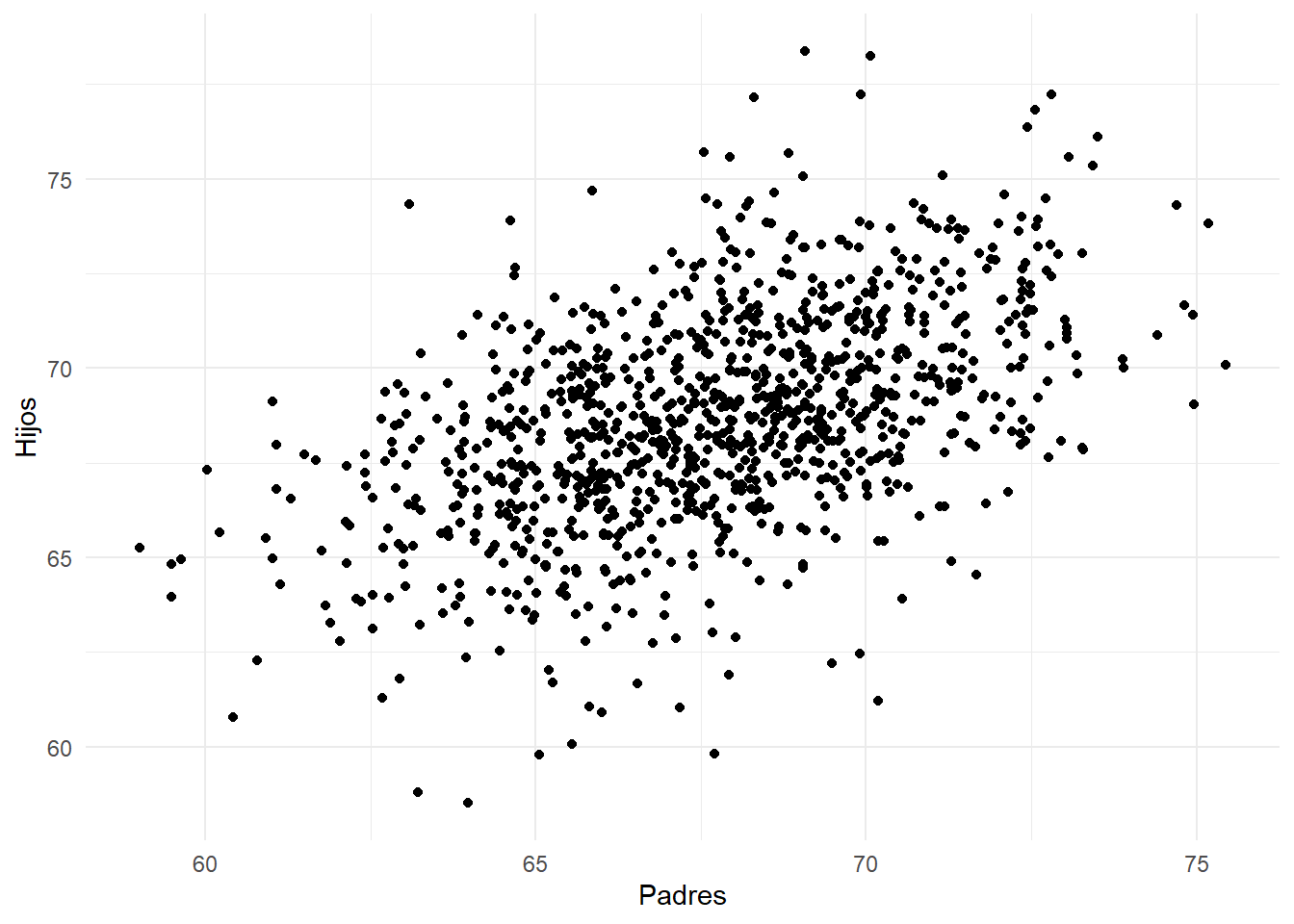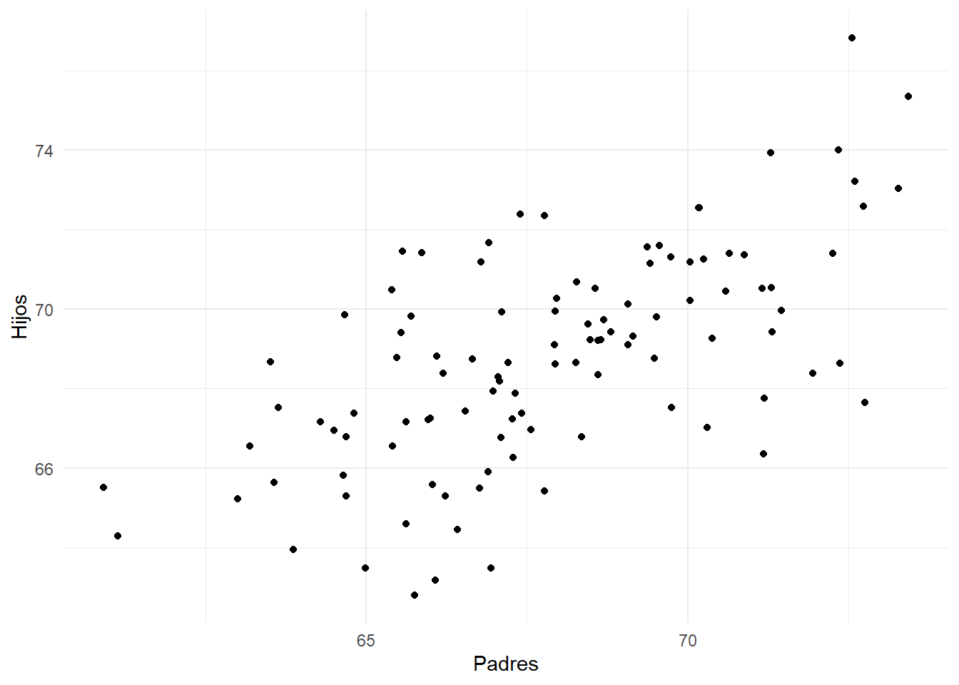 Karl Pearson recopiló en 1903 las alturas de 1078 parejas formadas por un padre y un hijo. Cada fila contiene las alturas en pulgadas de un par Padre-Hijo.
