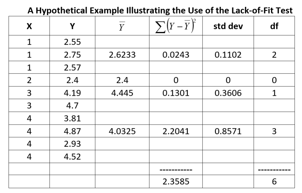 • \(SSLF\): Lack-of-Fit Sum of Squares, which measures variation between the fitted regression line and the group means.