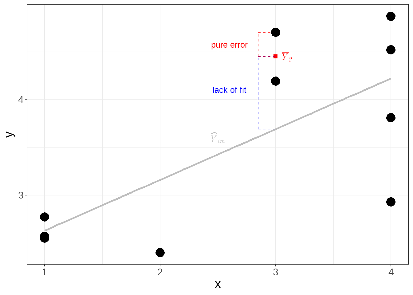 • \(SSPE\): Pure Error Sum of Squares, which measures variation among replicates (observations with the same predictor value).