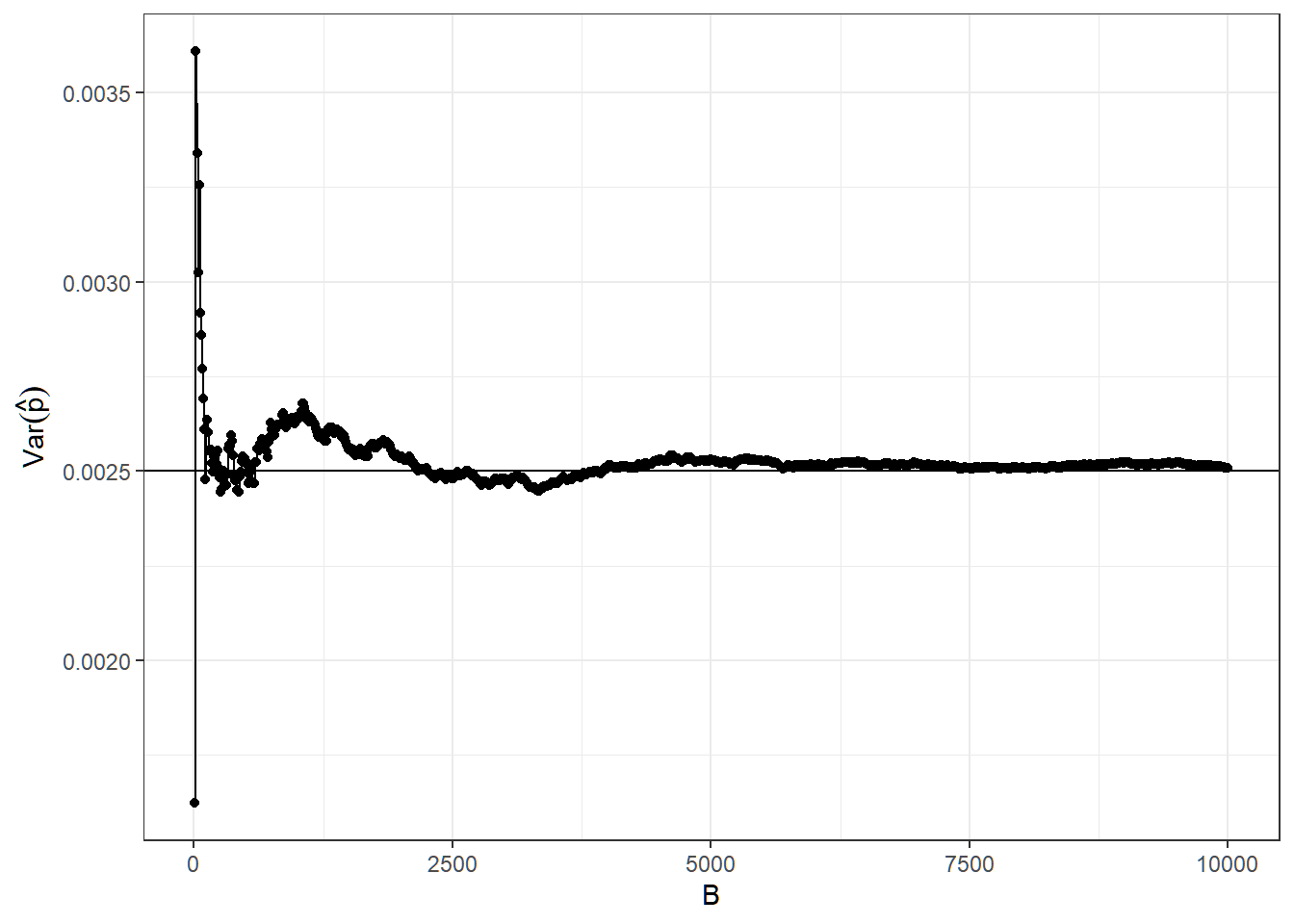 The following is an example function that implements Bootstrap to approximate the variance of the proportion estimator \(\hat{P}\).
