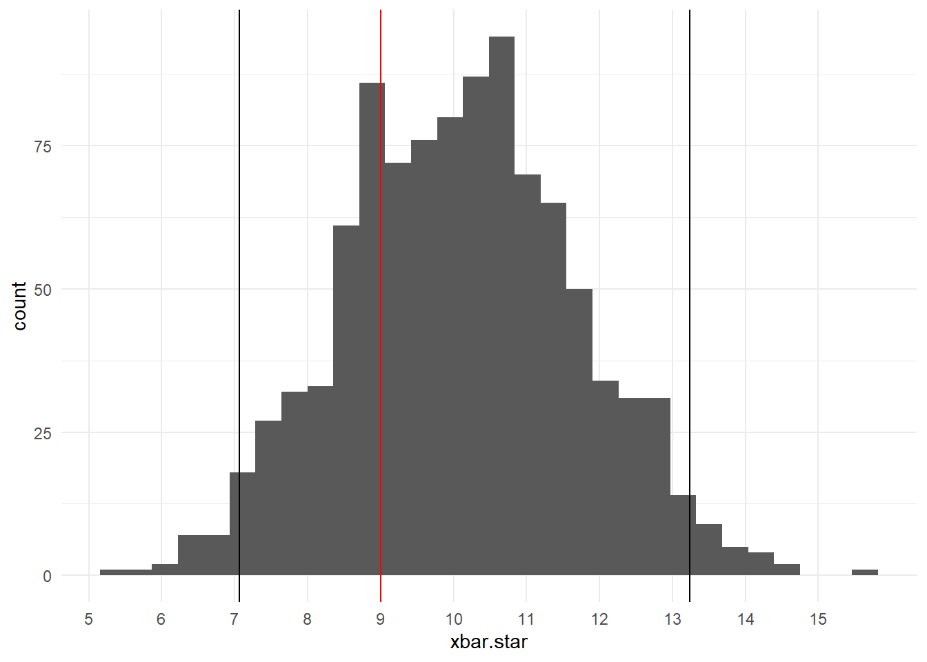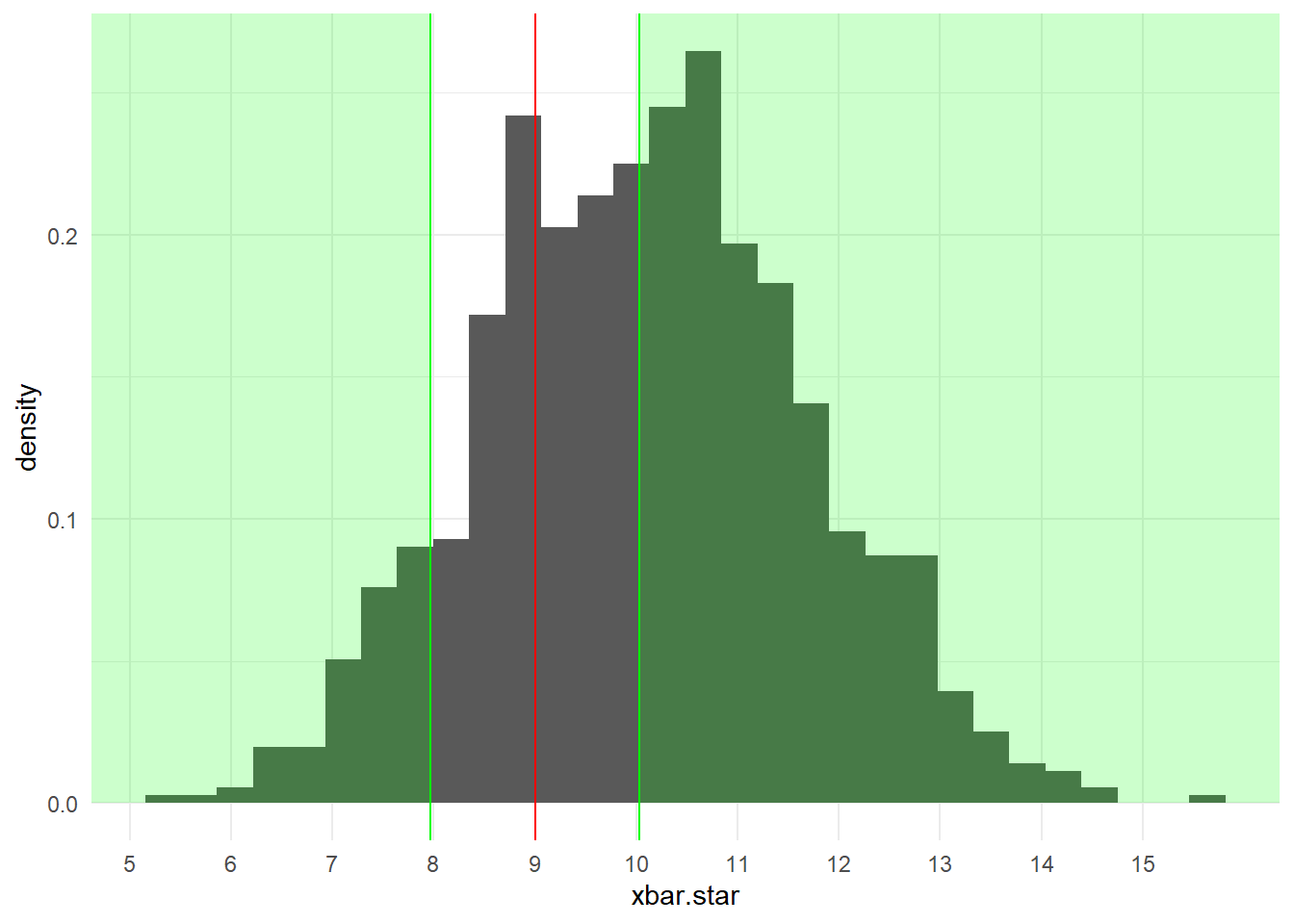 For our example, the observed statistic is \(\bar{X}=10.0333\). From the different values \(\bar{X}_b^*\), we want to find the proportion of bootstrap estimates that are more extreme than the observed \(\bar{X}\):
