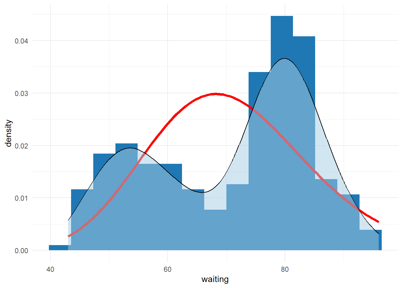 The faithful dataset contains 272 observations of eruption waiting times (in minutes) for the Old Faithful geyser in Yellowstone National Park.