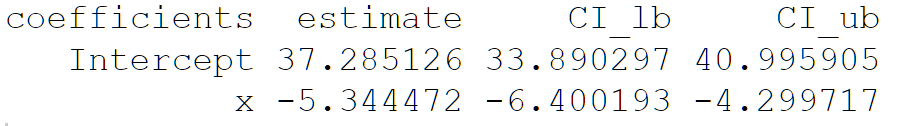 Apply this function on the vectors mtcars$mpg and mtcars$wt as the dependent and independent variables respectively, with \(B = 2000\) and \(\alpha=0.05\)