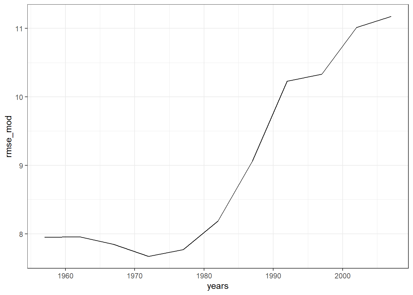 lifeExpof each country per year, and show how the RMSE changes through the years. It should look something like this: