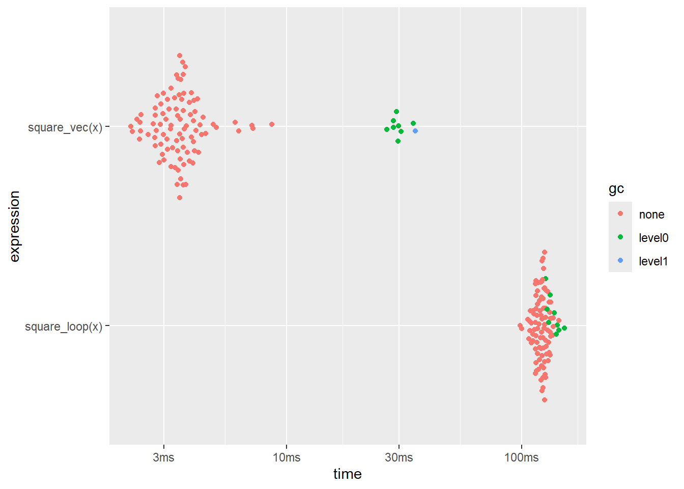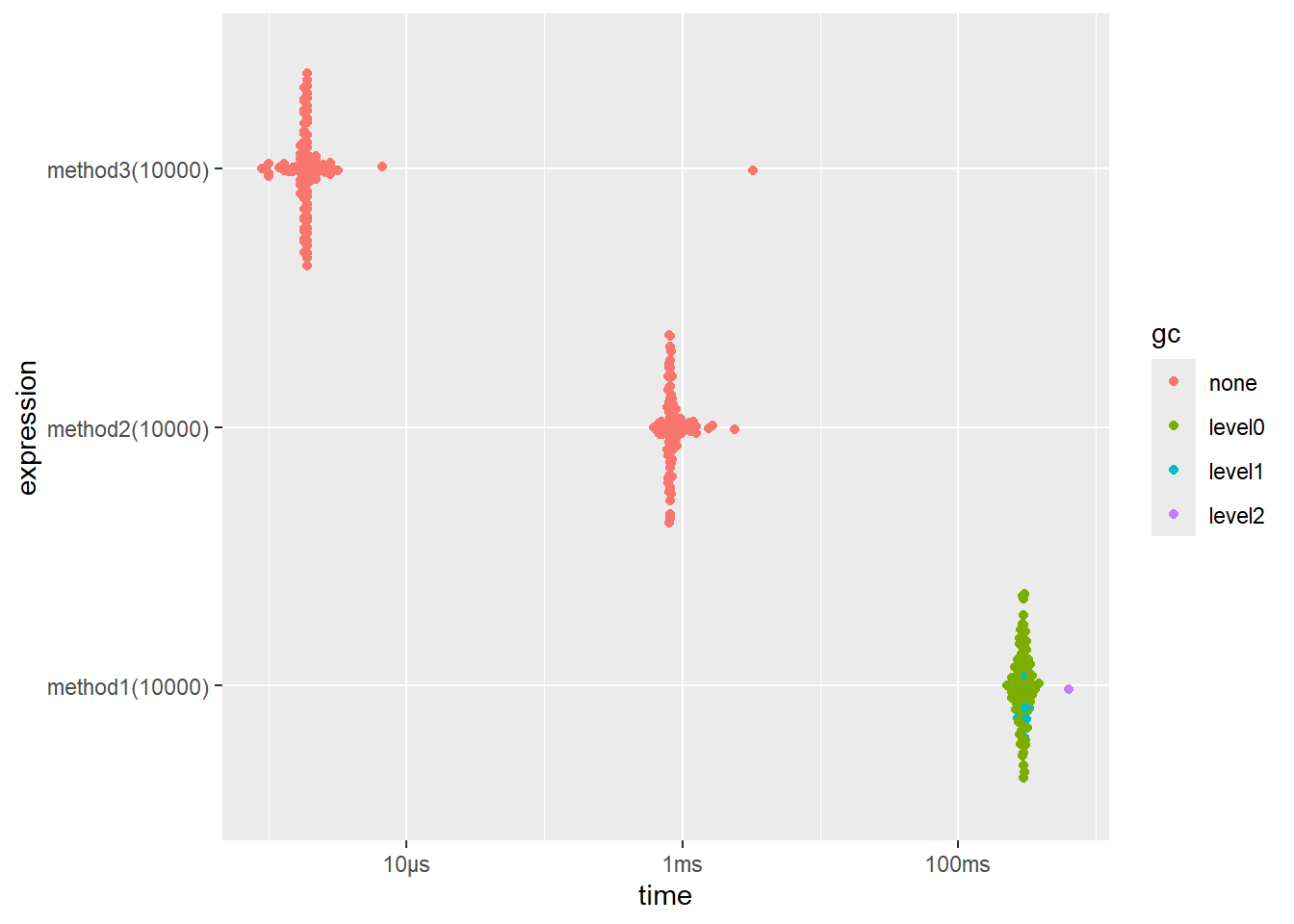 result <- bench::mark( method1(1e4), method2(1e4), method3(1e4), iterations = 100, time_unit = "ms" ) result[c("expression", "min", "median", "itr/sec", "n_gc")]