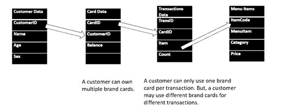 ## [1] "cards" "customers" "menu" "transactions"customers: customer informationcards: a list of card ids, customer id of the owner, and remaining balance in the card. A customer may own multiple brand cards.transactions: a list of the items bought in a certain transaction (order). There’s a unique id for each transaction. Take note, transactions require a brand card (which is a reloadable debit card). There may be multiple rows for a single transaction here.menu: a list of item codes, corresponding item names, general category, and price