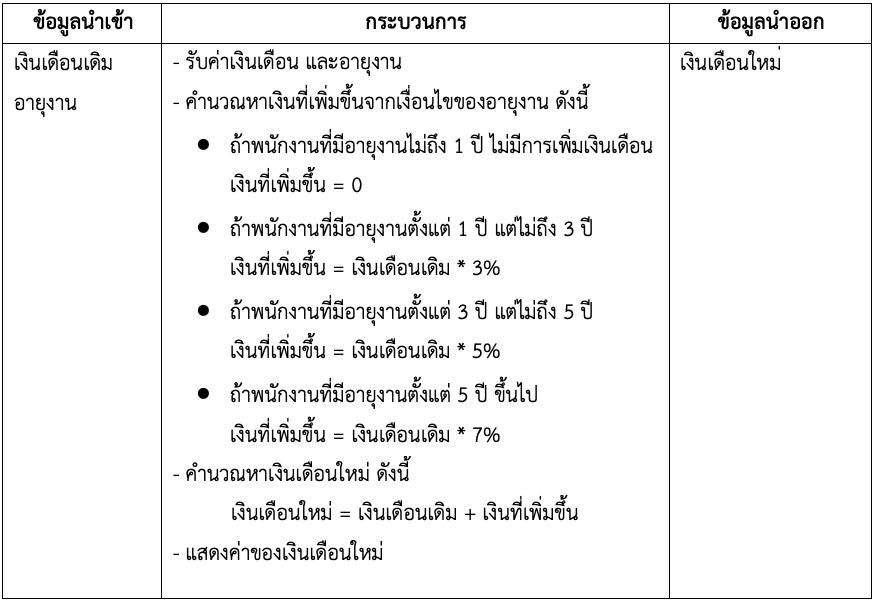 ตัวอย่างที่ 1.12 การกำหนดตัวแปรและการเขียนขั้นตอนวิธีการคำนวณเงินเดือนจากตัวอย่างที่ 1.4 การคำนวณเงินเดือนใหม่ให้กับพนักงานของบริษัทแห่งหนึ่ง ซึ่งอัตราการขึ้นเงินเดือนมีเงื่อนไขตามอายุงาน ดังนี้