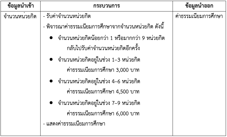 ตัวอย่างที่ 1.7 การบรรยายขั้นตอนจากโจทย์ข้อที่ 1.5 มหาวิทยาลัยแห่งหนึ่งเรียกเก็บค่าธรรมเนียมการศึกษาในภาคฤดูร้อน ในอัตราดังนี้