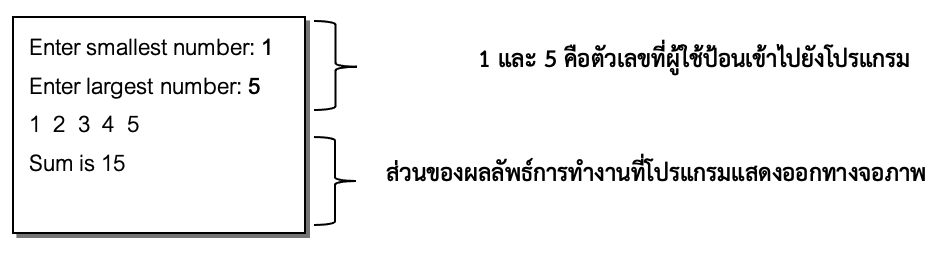 ผลลัพธ์ที่แสดงทางจอภาพเมื่อทำงานตามผังงานภาพที่ 1-10 เมื่อป้อนเลข 1 กับ 5