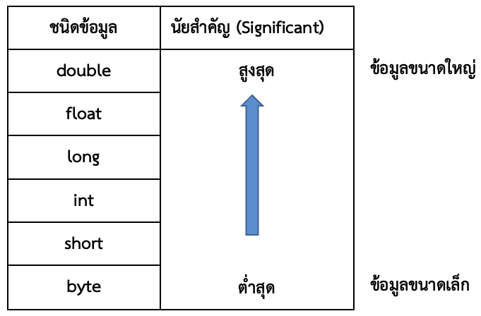 - การเปลี่ยนชนิดข้อมูลโดยปริยาย (implicit type conversion) เป็นการแปลงชนิดข้อมูลที่ภาษาจาวาทำให้โดยอัตโนมัติ ตัวอย่างเช่น เมื่อนำข้อมูลตัวเลขจำนวนเต็มชนิด int ไปเก็บในตัวแปรชนิด double ข้อมูลจะถูกเปลี่ยนเป็นตัวเลขทศนิยมชนิด double โดยอัตโนมัติ หรือการนำข้อมูลชนิด byte ไปใส่ในตัวแปรชนิด int เป็นต้น สำหรับข้อมูลในกลุ่มตัวเลขนั้นการนำข้อมูลชนิดที่มีนัยสำคัญต่ำกว่าไปเก็บในตัวแปรที่มีนัยสำคัญสูงกว่าภาษาจาวาจะเปลี่ยนชนิดข้อมูลให้แบบอัตโนมัติ นัยสำคัญของชนิดข้อมูลเป็นดังตารางที่ 2.2