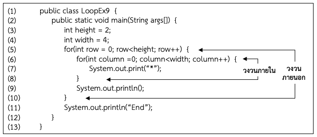 จากโปรแกรมในตัวอย่างที่ 5.9 วงวนภายนอกจะทำซ้ำ 2 รอบ และวงวนภายในจะทำซ้ำ 4 รอบเพื่อพิมพ์ * ดังนั้นผลการทำงานของวงวนภายในคือพิมพ์ * จำนวน 4 ครั้ง แต่เนื่องจากวงวนภายนอกมาควบคุมให้วงวนภายในต้องซ้ำตั้งแต่ต้นทั้งหมด 2 ครั้ง ผลการทำงานจึงมีการพิมพ์ * ทั้งหมด 8 ครั้งใน 2 บรรทัด ผังงานของโปรแกรมเป็นดังภาพที่ 5-7