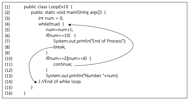 จากโปรแกรมในตัวอย่างที่ 5.10 มีการวนซ้ำโดยใช้คำสั่ง while ซึ่งเงื่อนไขเป็นจริงตลอดไป แต่การวนซ้ำรอบที่ num = 2 กับรอบที่ num = 6 เงื่อนไขของคำสั่ง if เป็นจริงบรรทัดที่ 10 ทำให้โปรแกรมทำคำสั่ง continue ในบรรทัดที่ 11 โปรแกรมจึงขึ้นรอบใหม่โดยข้ามคำสั่งพิมพ์ค่า num ไปทำให้ในรอบที่ num = 2 กับรอบที่ num = 6 ผลการทำงานของโปรแกรมไม่มีการพิมพ์ค่า num และในส่วนของเงื่อนไข if ในบรรทัดที่ 6 เป็นจริงเมื่อ num = 10 จึงไปทำคำสั่ง break แล้วจึงหยุดหรือสิ้นสุดการทำซ้ำของวงวนนี้