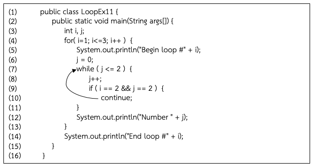 จากโปรแกรมในตัวอย่างที่ 5.11 คำสั่ง continue จะไปขึ้นรอบใหม่ของวงวน while ( j <= 2 ) ซึ่งเป็นวงวนในสุดที่คำสั่ง continue นี้สังกัดอยู่ ดังนั้นในรอบที่ค่า i = 2 และ j = 2 เงื่อนไขของ if เป็นจริง โปรแกรมจึงทำคำสั่ง continue ในบรรทัดที่ 10 แล้วกลับขึ้นไปทำงานที่ต้นวงวนของ while ทำให้ไม่ได้ทำคำสั่งพิมพ์ค่า num ผลลัพธ์ของโปรแกรมจึงไม่มีการพิมพ์ค่า num ในรอบที่ i = 2 และ j = 2