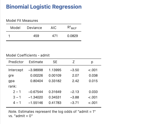 “rank” เป็นตัวแปรที่มีค่าเป็น 1 ถึง 4 ซึ่งบ่งบอกถึงระดับของสถาบันการศึกษา โดยที่ 1 คือมีชื่อเสียงสูงที่สุดและ 4 คือมีชื่อเสียงต่ำที่สุด