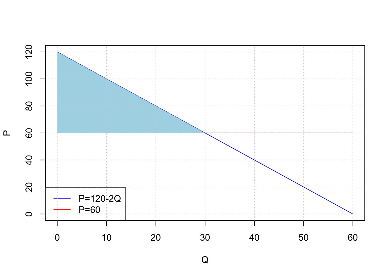 ถ้าอุปสงค์คือ \(P = 120 - 3Q\), ราคาตลาดคือ \(P = 60\) จงหาส่วนเกินผู้บริโภค