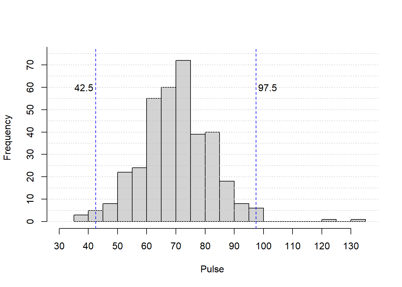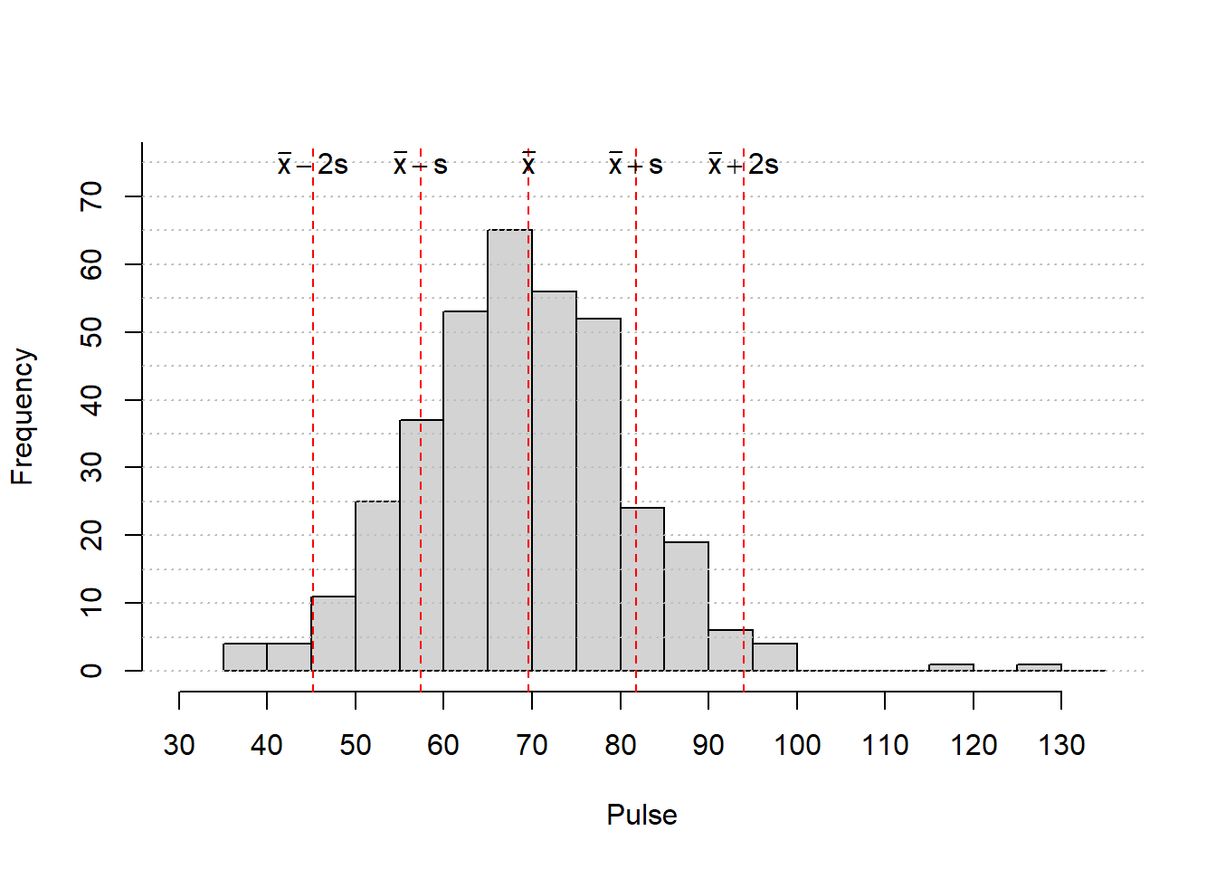 - Hence, we expect 95% of the pulse rates in this sample to be in the interval \((\bar{x}-2s, \bar{x}+2s,) = (70 - 27.5, 70 + 27.5) = (42.5, 97.5)\)