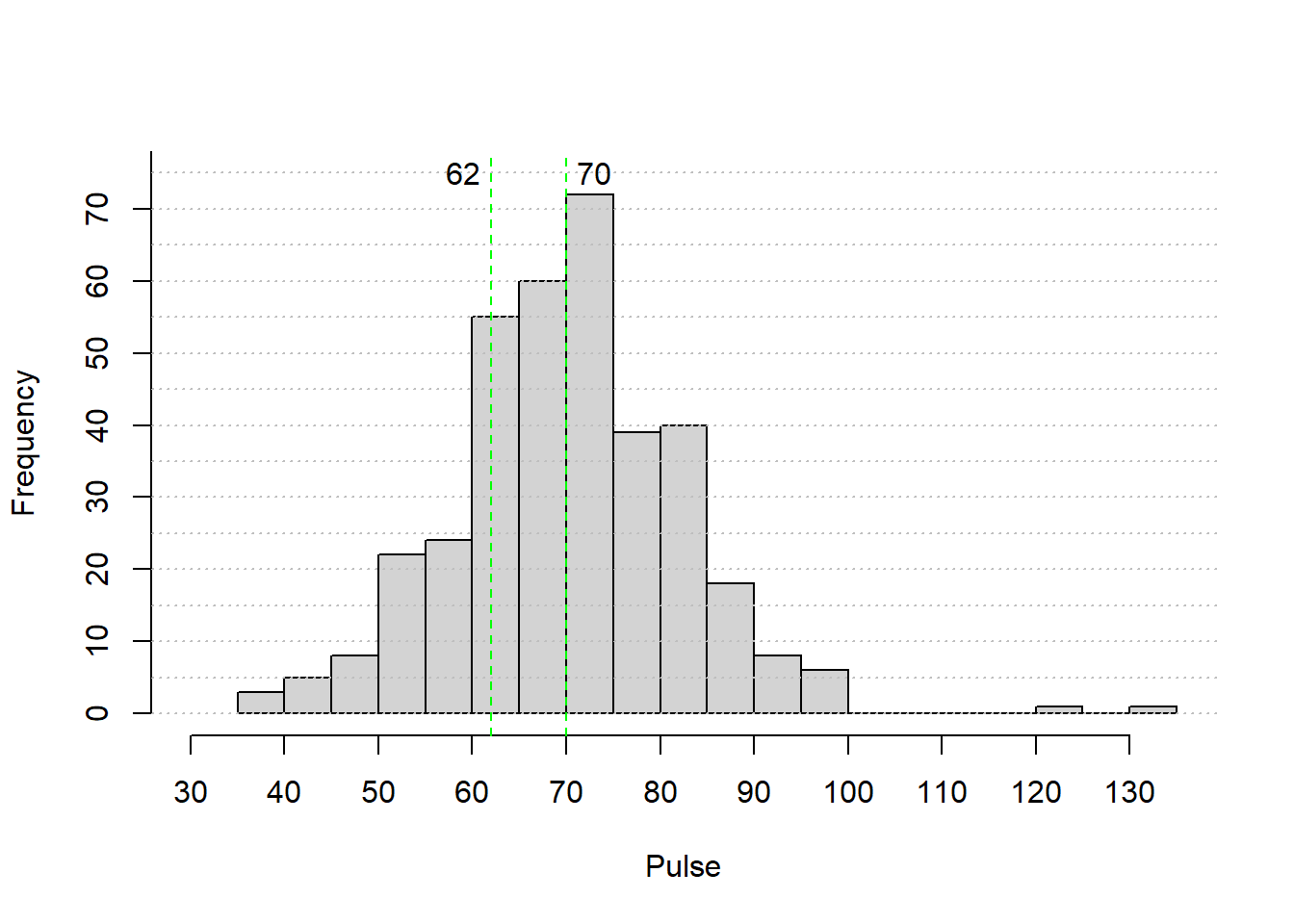 text(x=quantile(dataPulse, 0.50)+3, y = 75, quantile(dataPulse, 0.50))