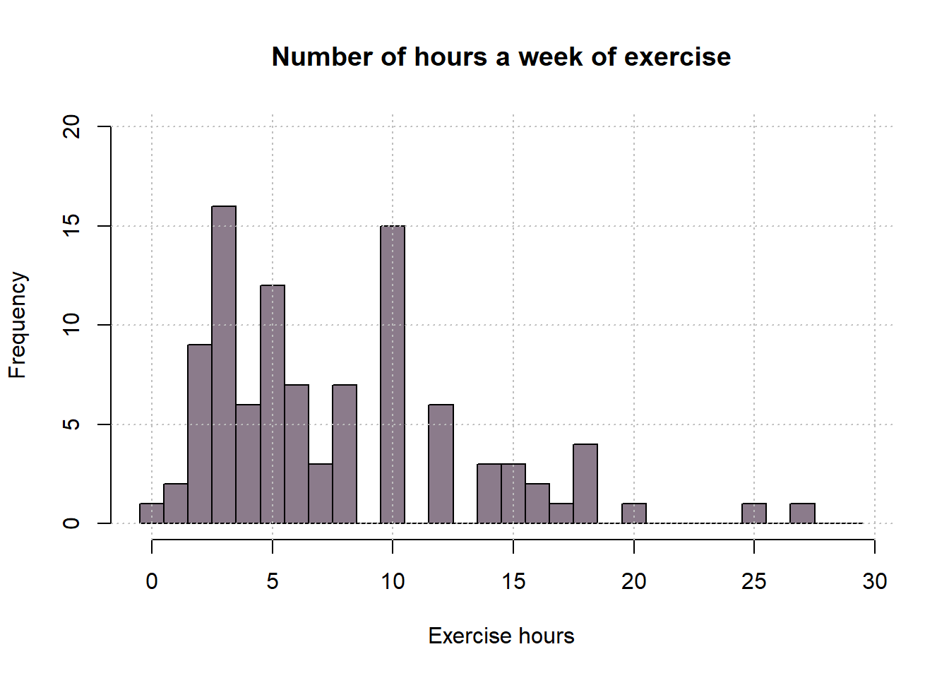 xlab = 'Exercise hours', ylab='Frequency', col='thistle4')