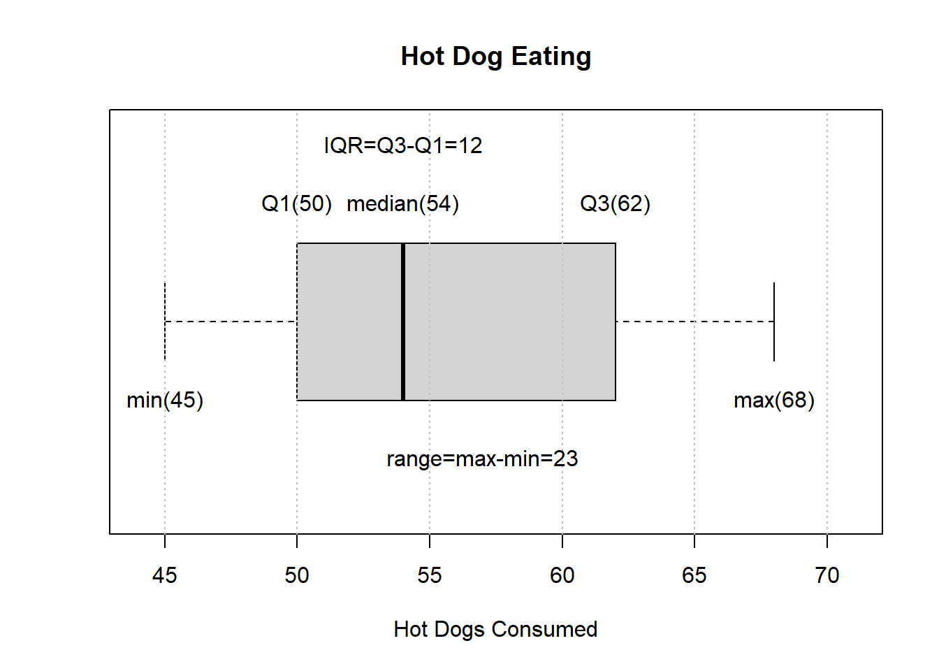 The boxplot below shows the number of hot dogs eaten by the winners of Nathan’s Famous hot dog eating contest 2002-2015.11