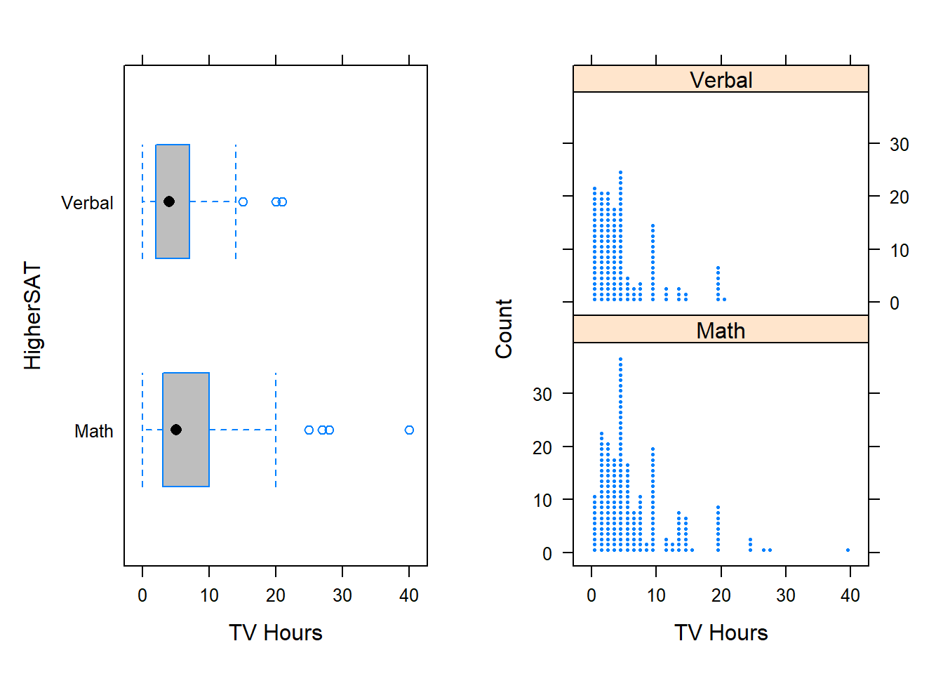 Who watches more TV, students that score higher on their Math or English exam? The variables of interest here are TV (quantitative variable for the number of hours spent watching TV per week) and Best Exam (categorical variable with two categories: Math and Verbal). This data comes from the StudentSurvey dataset, where the participants are students.12