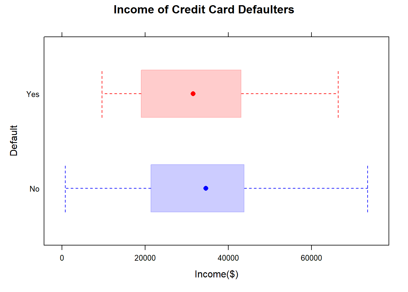 Here is another example of side-by-side boxplots. The credit card dataset contains a number of variables including whether a person has defaulted on their credit card payments (categorical variable: Default = Yes or Default = No)and their annual income (quantitative variable). The side-by-side boxplots show that the distributions of annual income for defaulters and non-defaulters are similar (we cannot differentiate defaulters and non-defaulters based on annual income). The medians and IQR are similar, but the range for non-defaulters is larger.