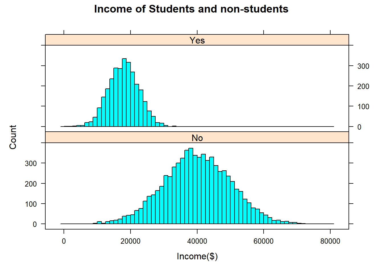 Another categorical variable in the credit card dataset is Student – whether the credit carder holder is a student or not (Student = Yes or Student = No).The side-by-side histograms show that the distributions of annual income for students and non-students are different, but they do have similar shapes(both are symmetric and bell-shaped). Students tended to have lower annual incomes with less spread (smaller standard deviation) than non-students for these data.