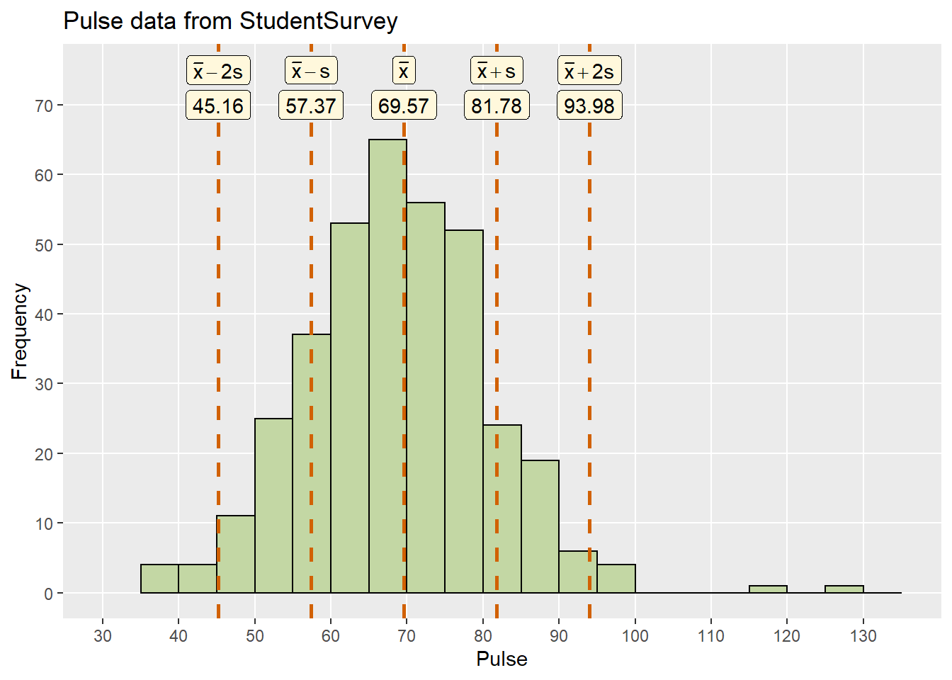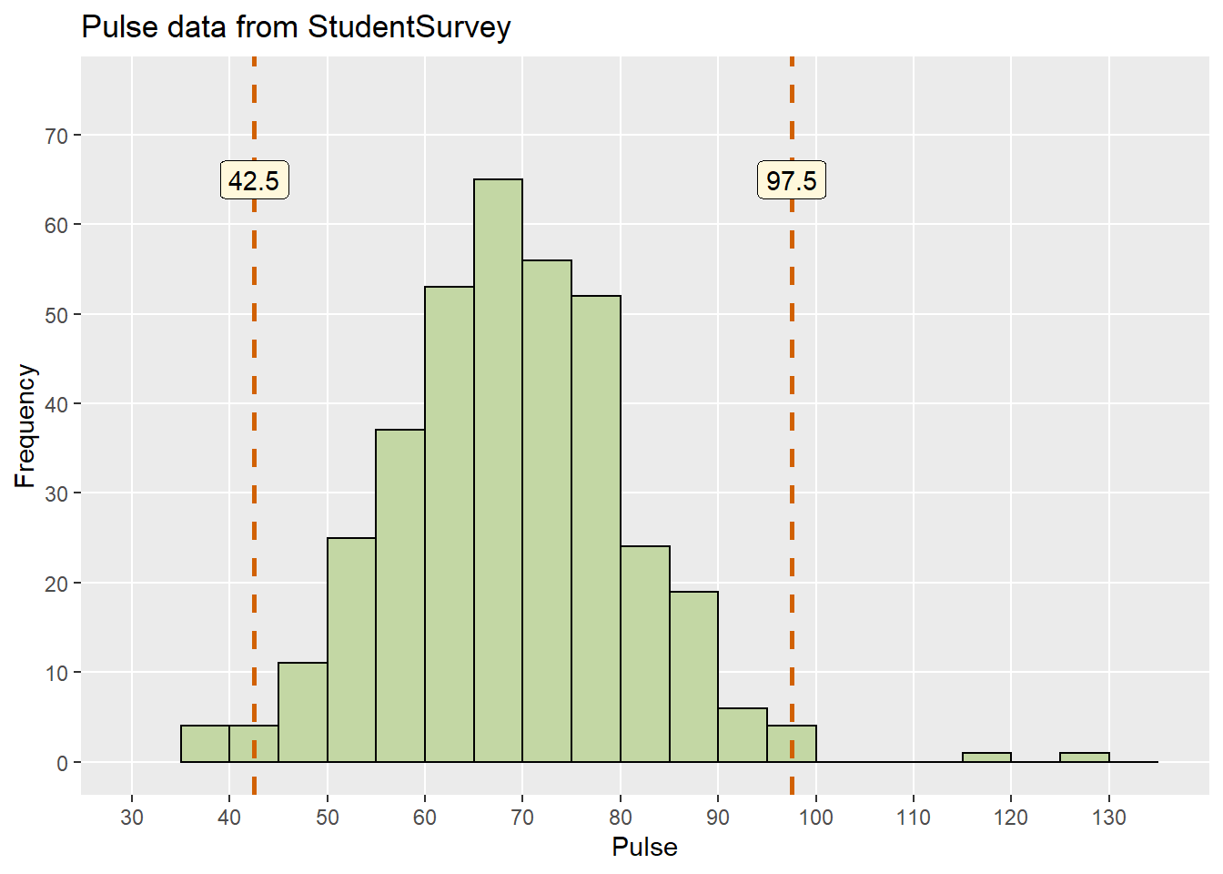 - Hence, we expect 95% of the pulse rates in this sample to be in the interval \((\bar{x}-2s, \bar{x}+2s,) = (70 - 27.5, 70 + 27.5) = (42.5, 97.5)\)