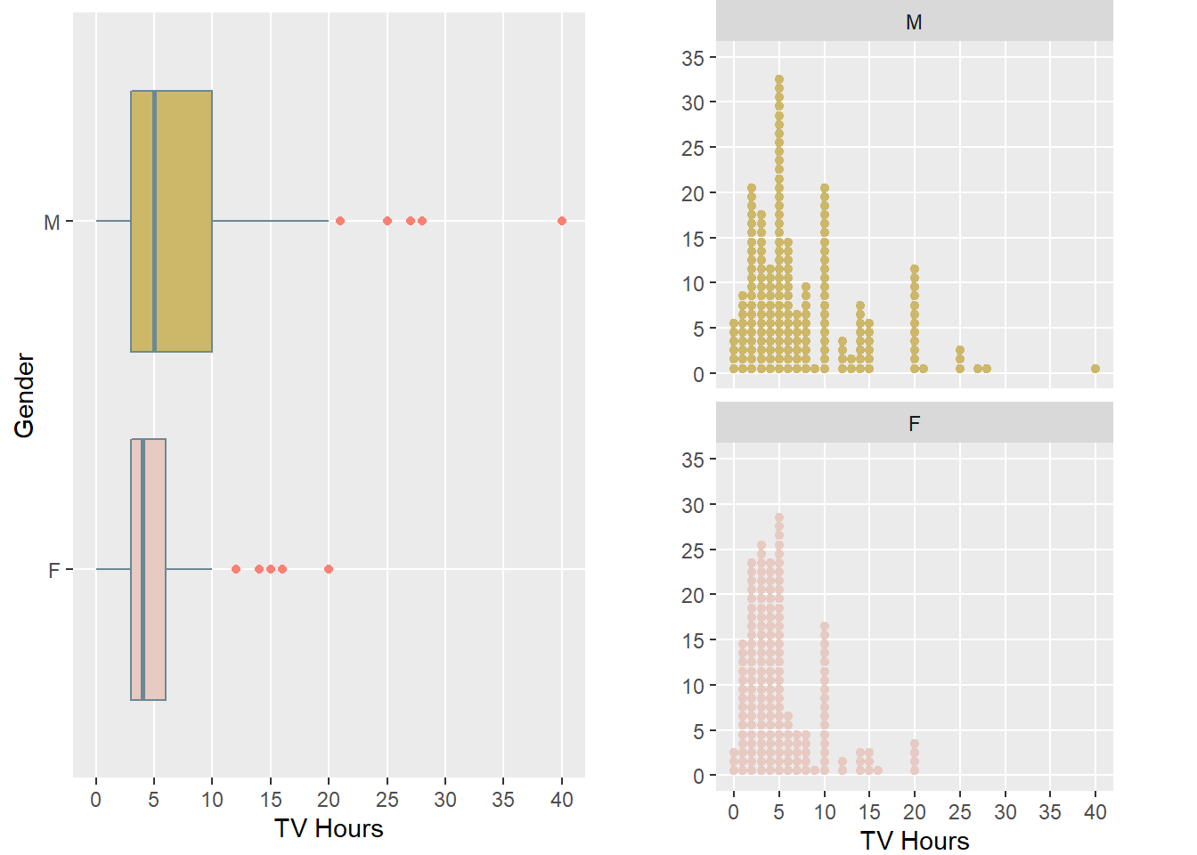 One of the best ways to visualise differences in groups is to use side-by-sideplots (dotplots, histograms, or boxplots), where each plot uses a commonnumerical axis.