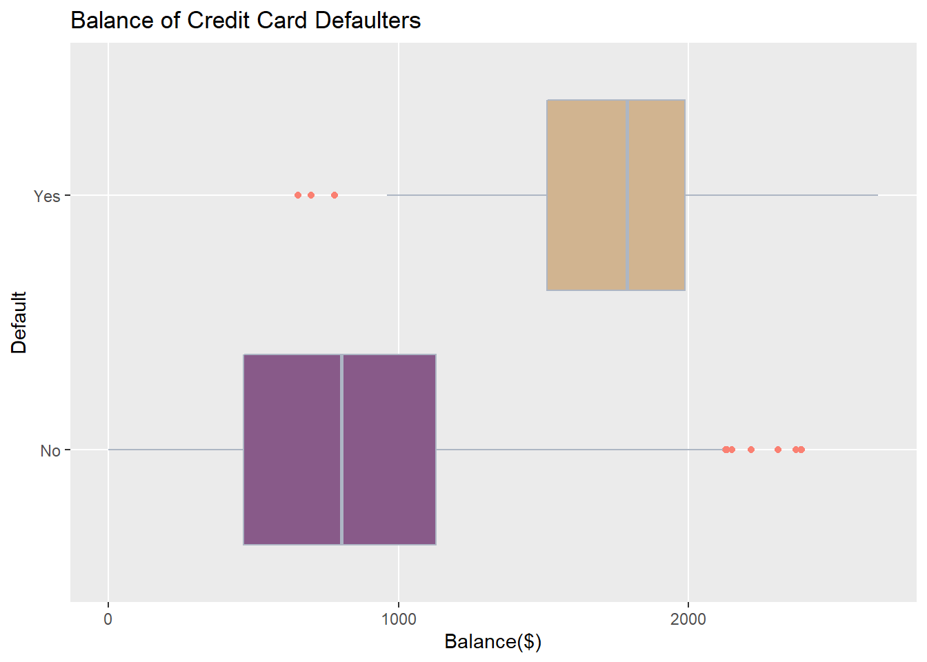 Another quantitative variable in the credit card dataset is Balance - the average balance that the customer had remaining on their credit card account after making their monthly payment. The side-by-side boxplots show that the distributions of Balance for defaulters and non-defaulters are very different.The median for defaulters is much larger than the median for non-defaulters,the IQRs do not overlap and outliers were present in both groups.Unsurprisingly, customers with larger credit card balances in these data were more likely to default on their monthly payments.