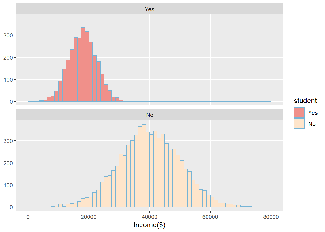 studentIncome <-ggplot(data, aes(x=income,fill=student)) +