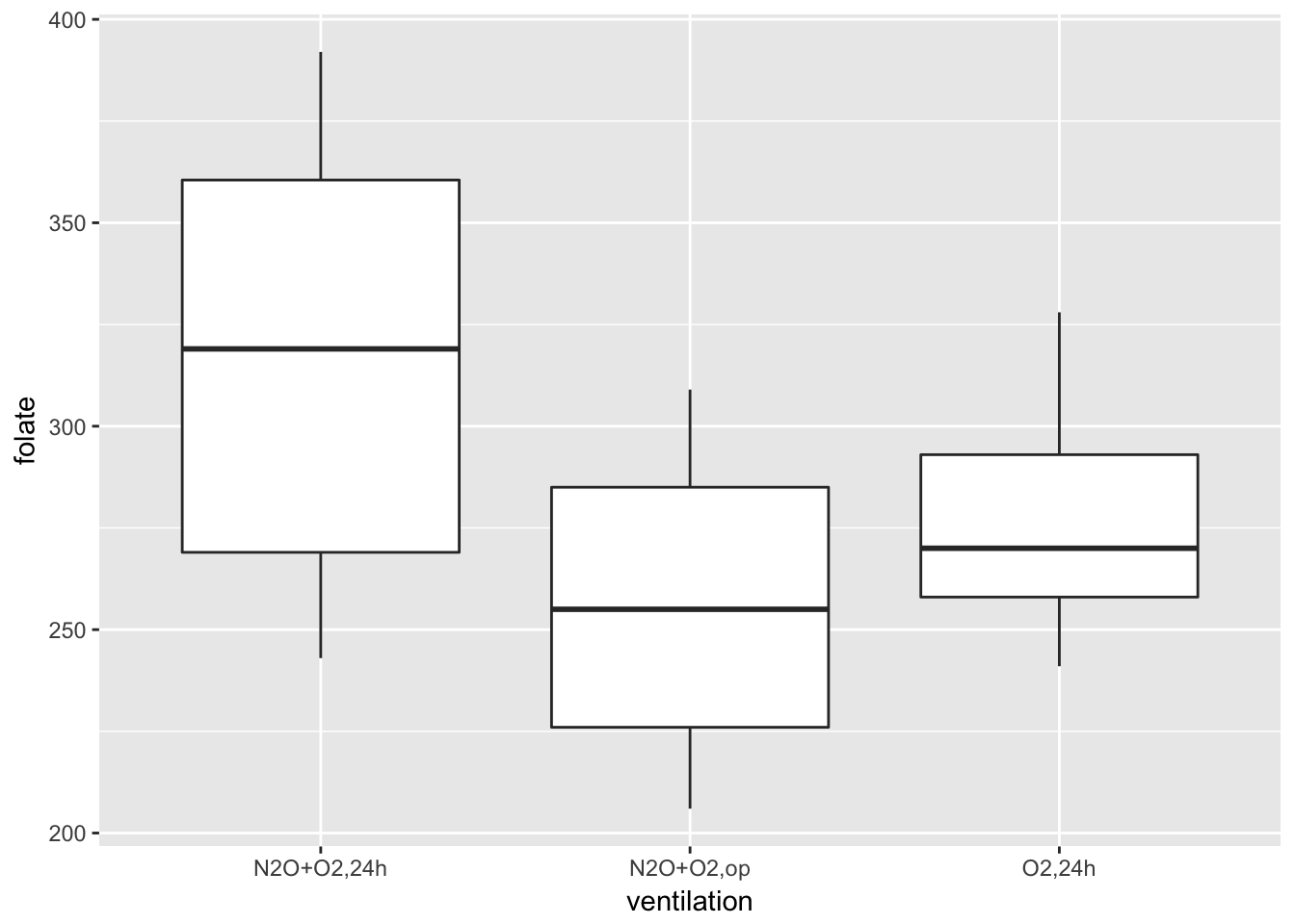 Looking at this data, it is not clear whether there is a difference. It seems that the folate level under treatment 1 is perhaps higher. We could try to compare the means of each pair of ventilations using t.test(). The problem with that is we would be doing three tests, and we would need to adjust our \(p\)-values accordingly. We are going to take a different approach, which is ANOVA.