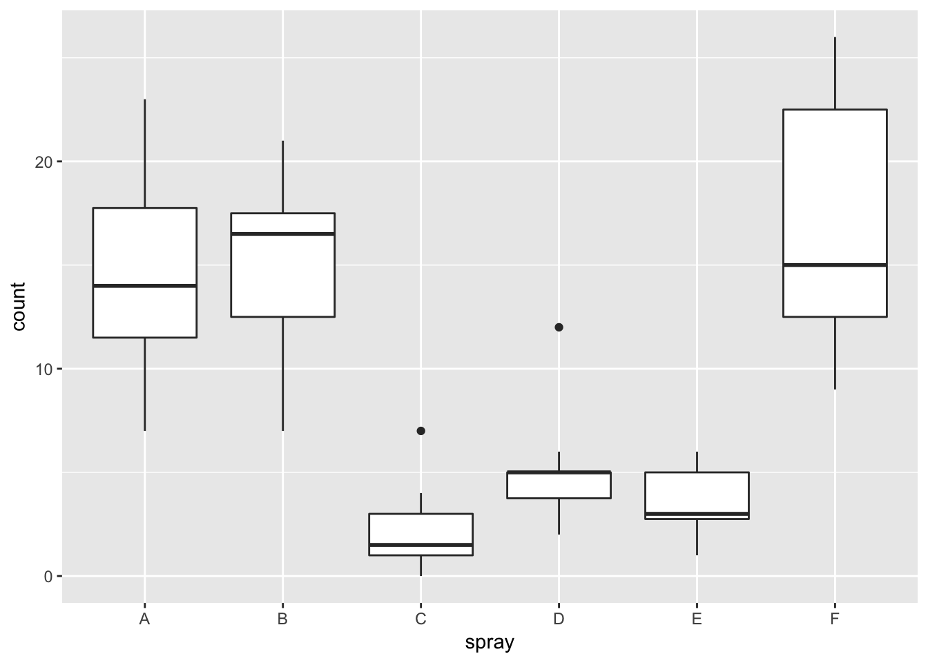 Not surprisingly, ANOVA strongly rejects the null hypothesis that all sprays have the same mean, with a \(p\)-value less than \(2.2 \times 10^{-16}\):